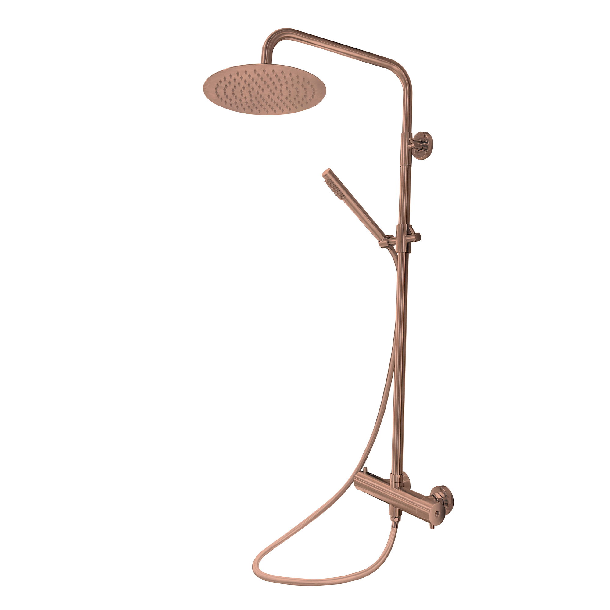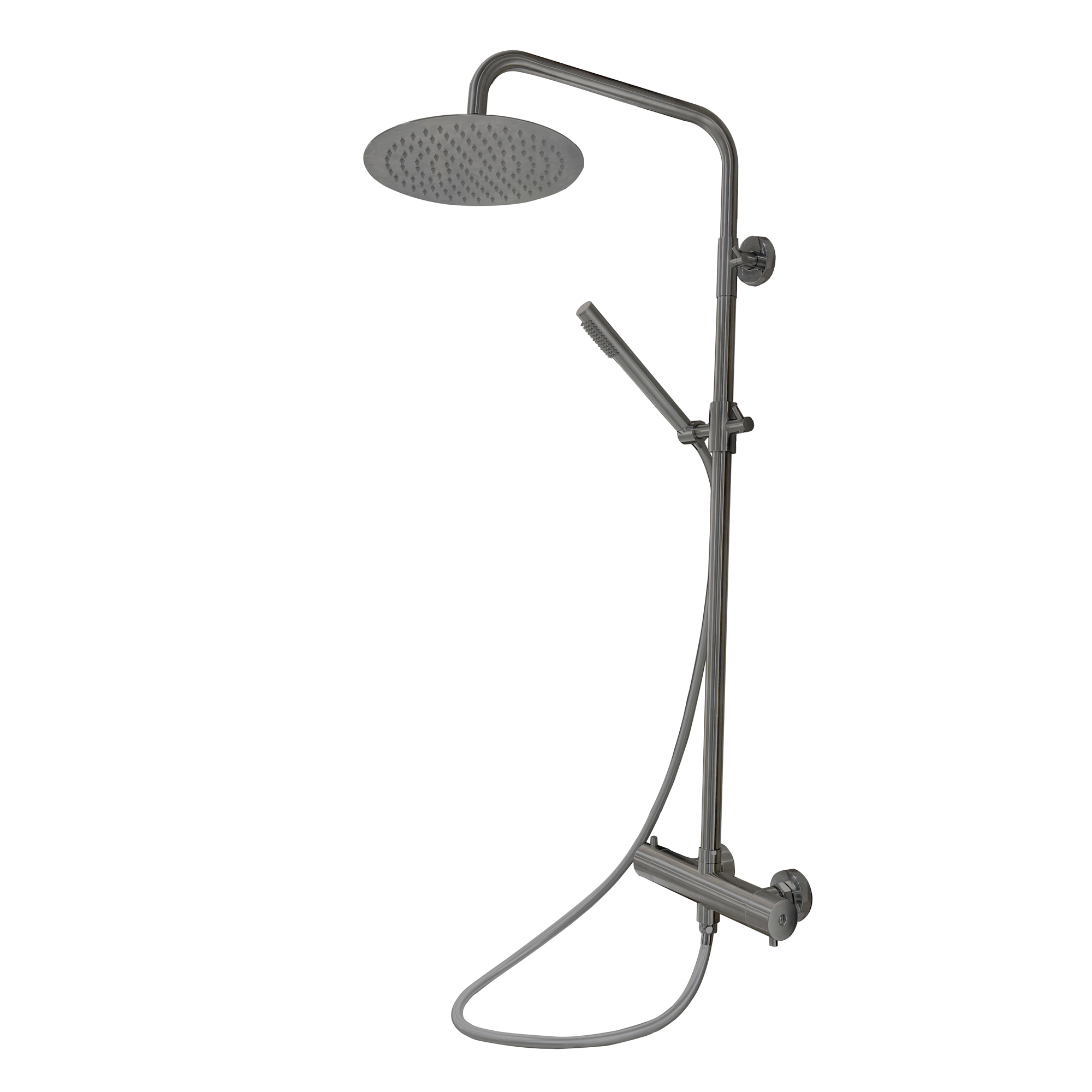 Levereras med tryckkompenserande termostat, 2 st. rosetter, duschslang, handdusch och Ø250 mm takdusch samt höj- och sänkbar duschstång. Tillverkad av rostfritt stål med borstad ytbehandling.