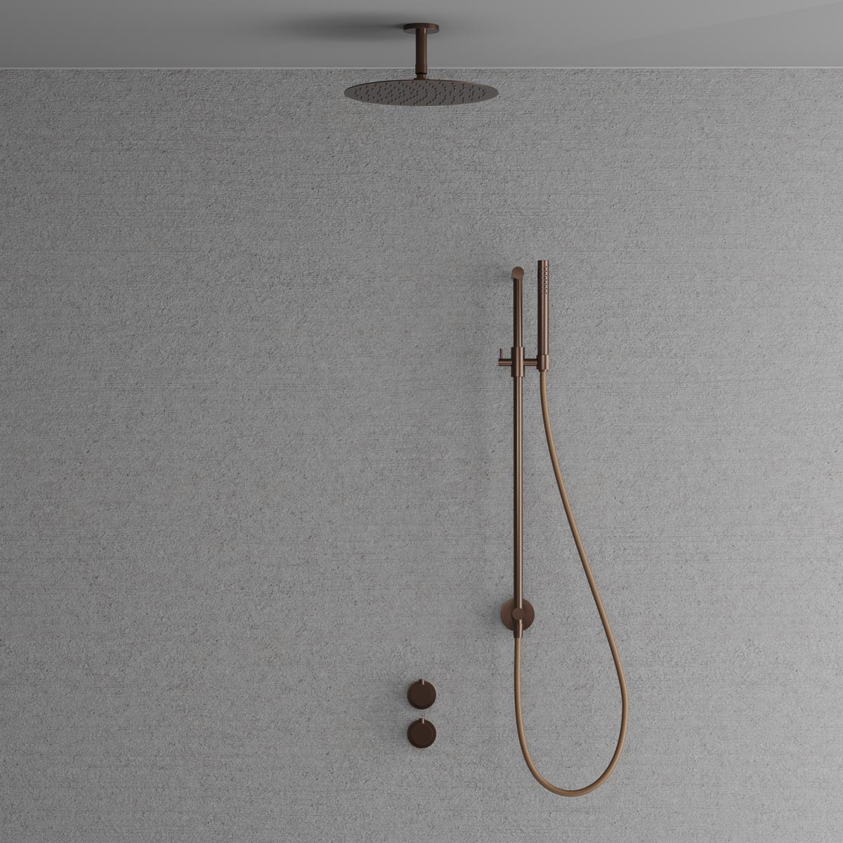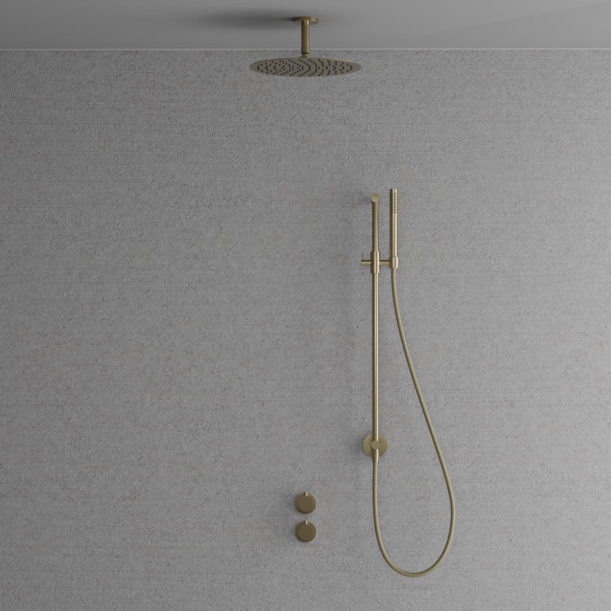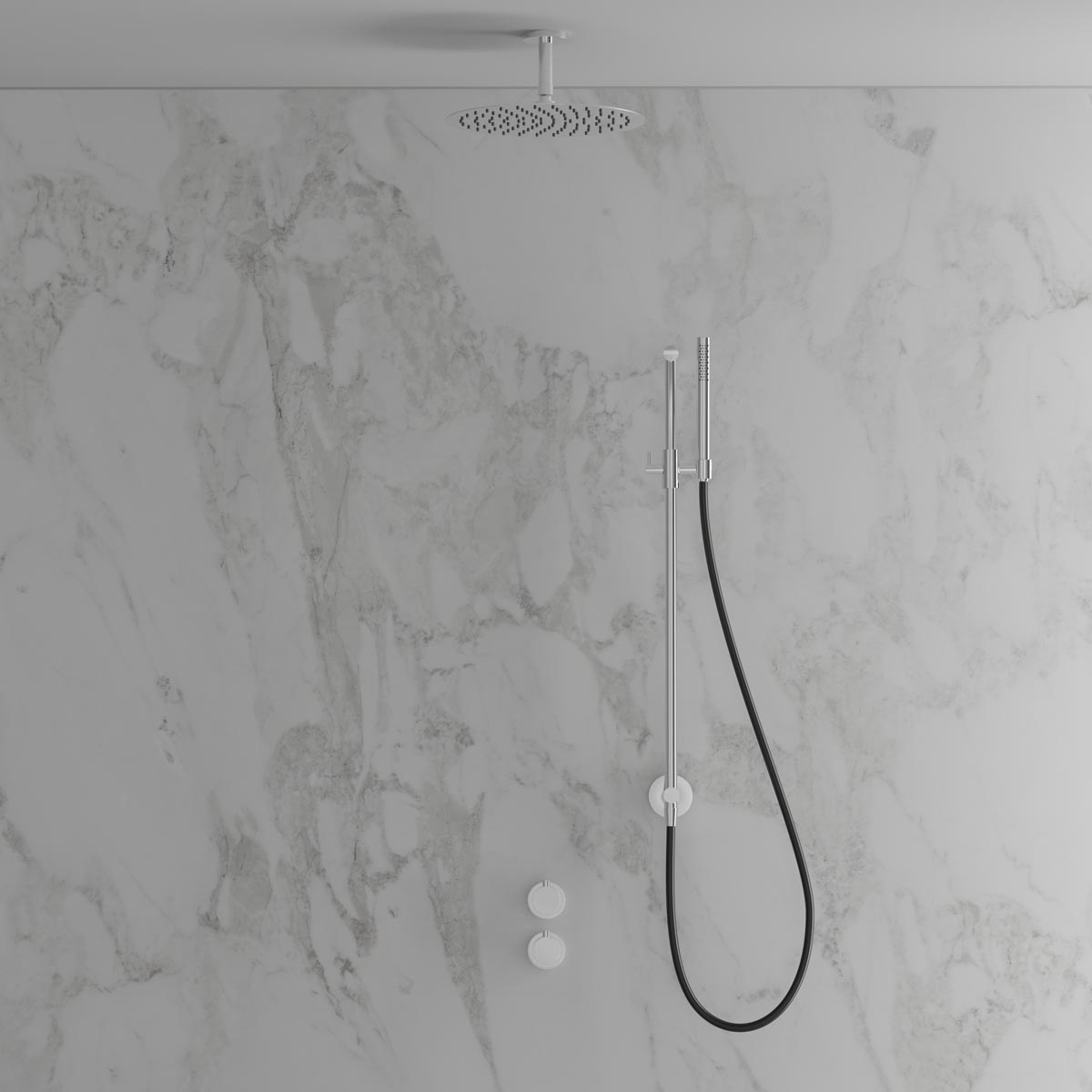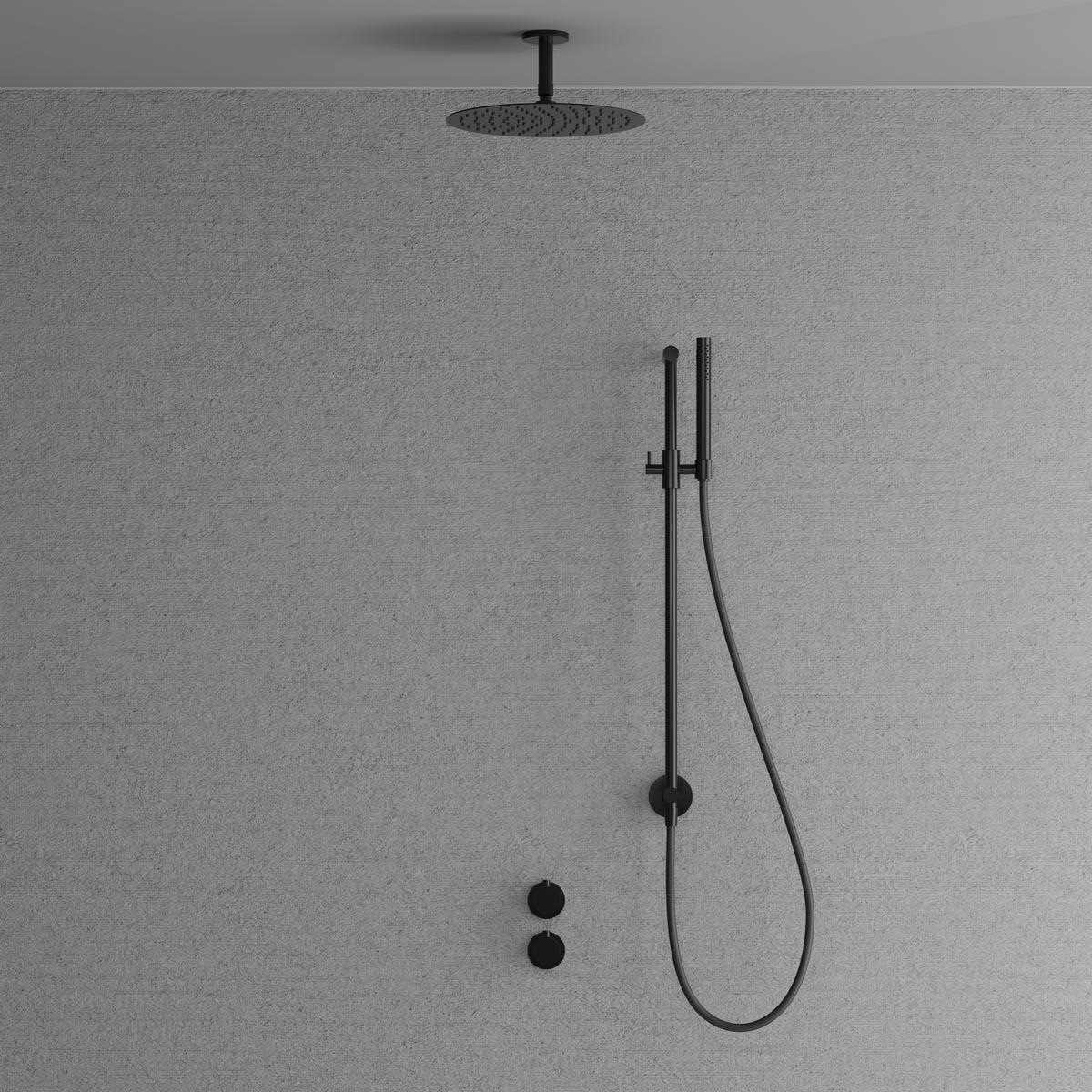 Dold montering bakom vägg ger badrummet ett minimalistiskt och harmoniskt intryck. Inkluderar en tunn takmonterad taksil med generös omkrets, en duschstång med reglerbart handduschfäste samt en cylindrisk handdusch som avger ett mjukt behagligt vattenflöde med bred spridning. Tidlös design som samspelar med ett skandinaviskt formspråk.