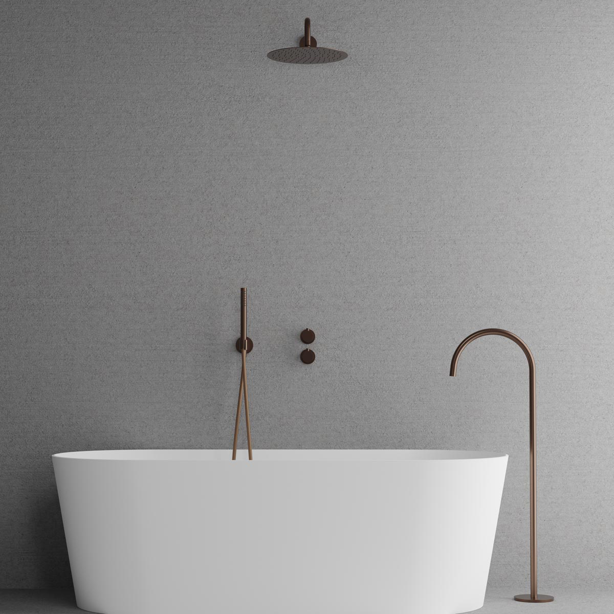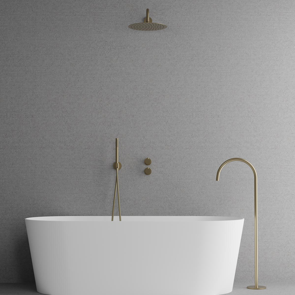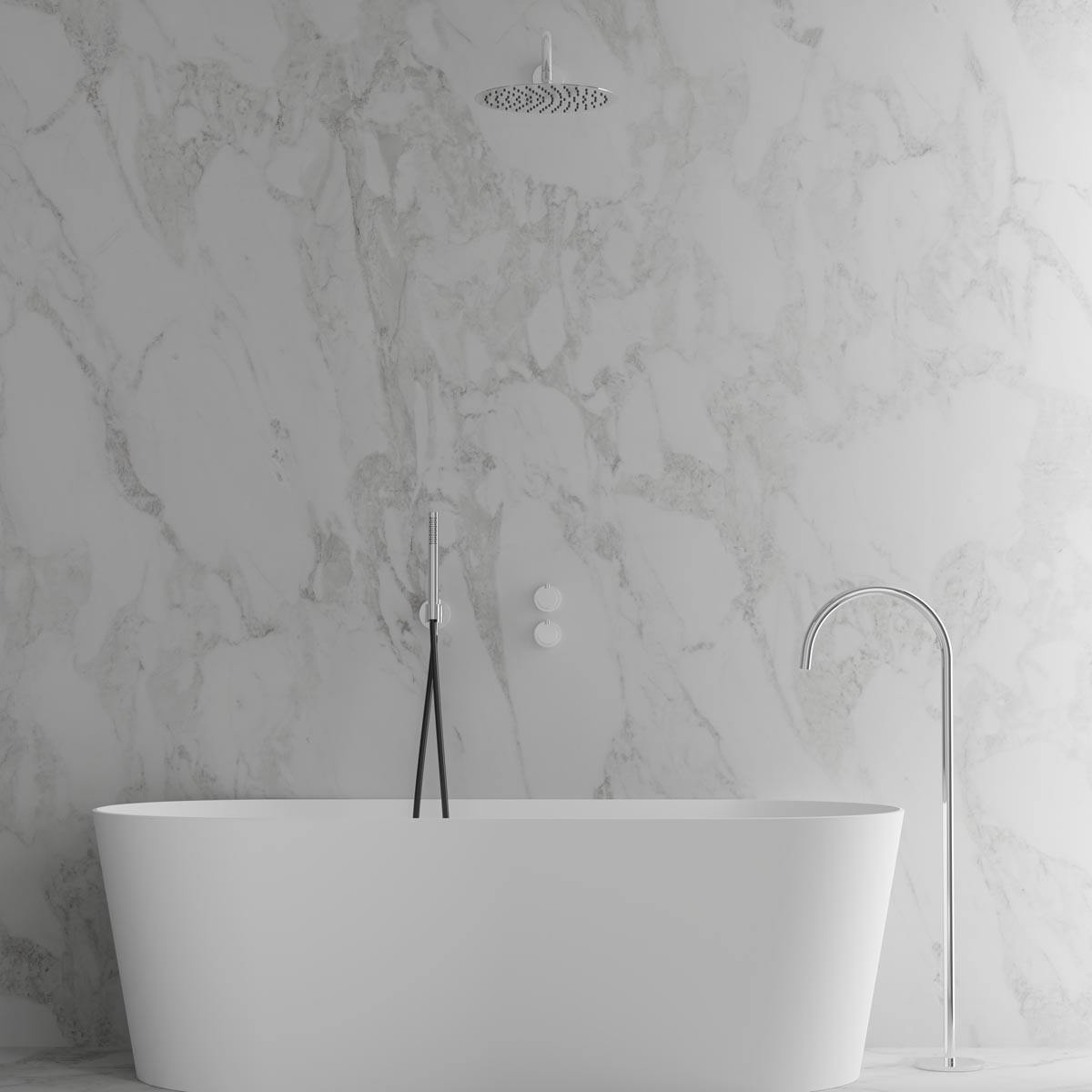 Takduschset Scandtap Steel Harmonized Bliss 3 är en badkarsblandare för inbyggnad med eleganta slimmade detaljer och en fristående badkarspip i mjuk design.