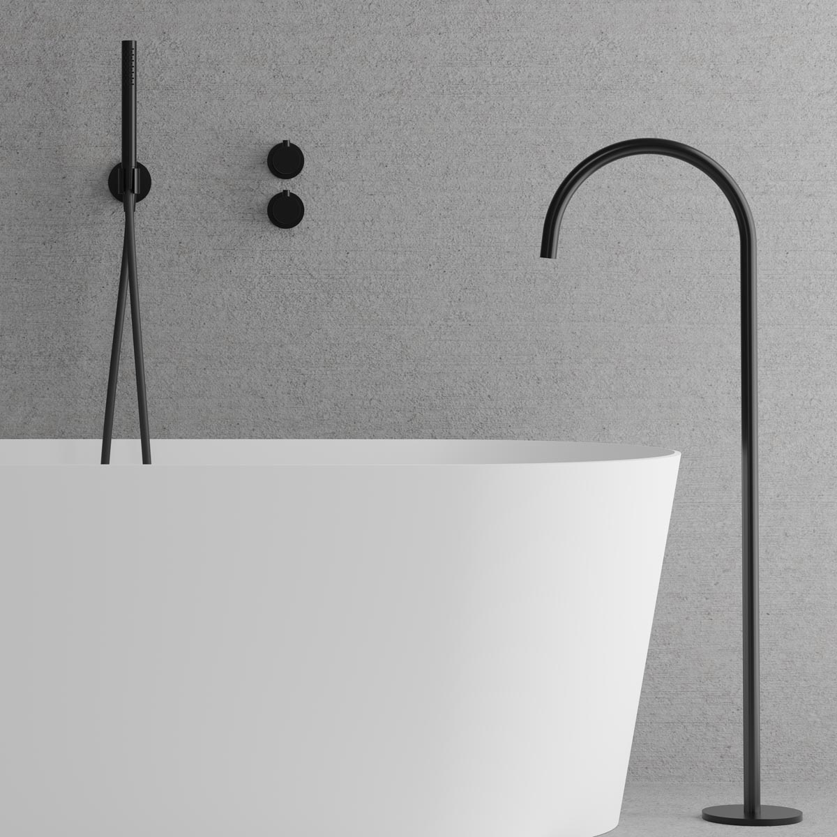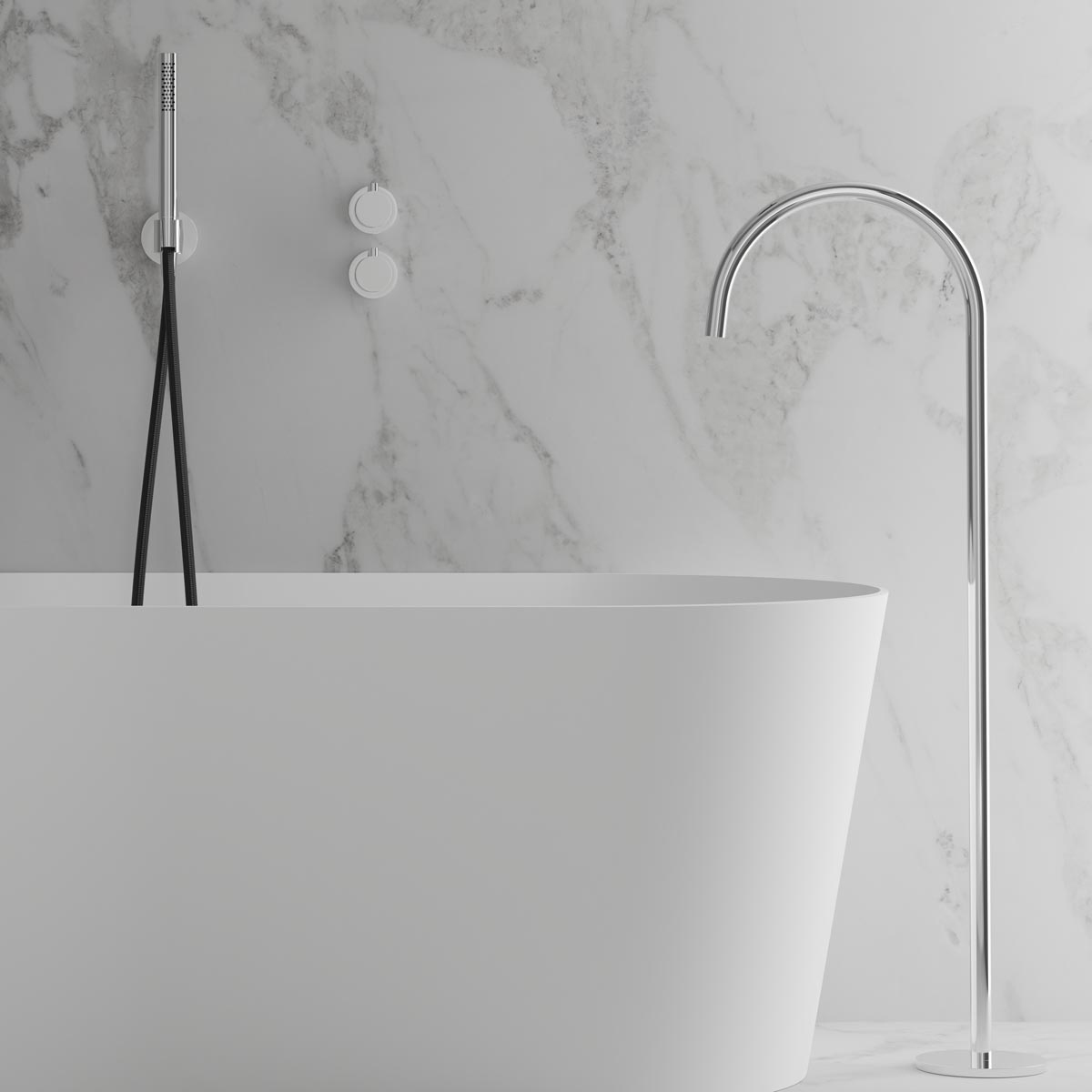 Takduschset Scandtap Steel Harmonized Bliss 4 är en badkarsblandare för inbyggnad med eleganta slimmade detaljer och en fristående badkarspip i mjuk design.