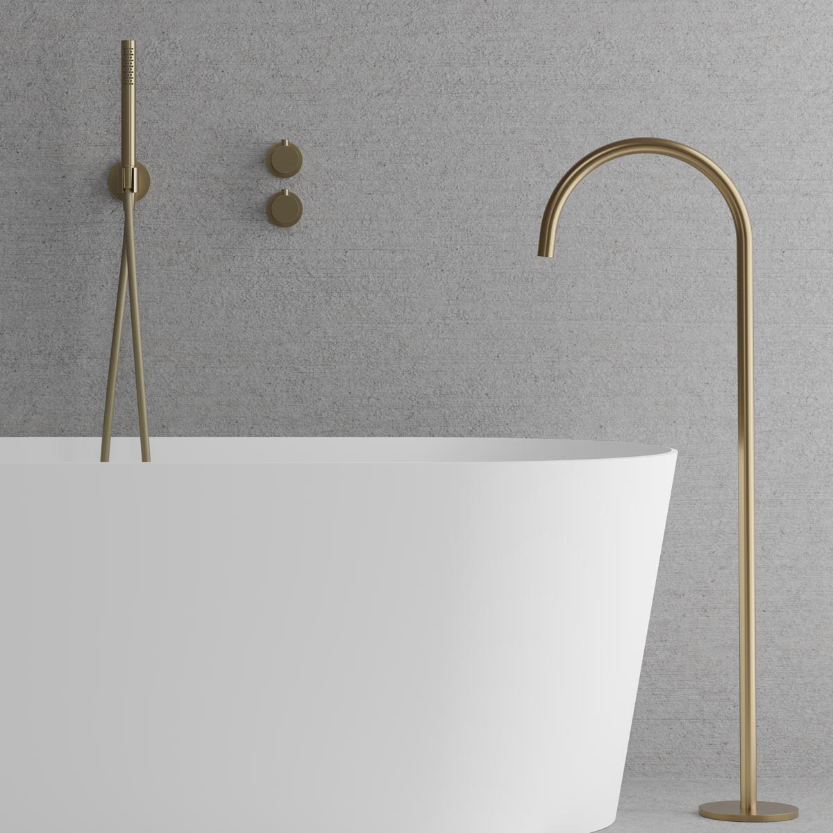 Inkluderar en cylindrisk handdusch som avger ett mjukt behagligt vattenflöde med bred spridning. Badkarspipen är i en fast position.