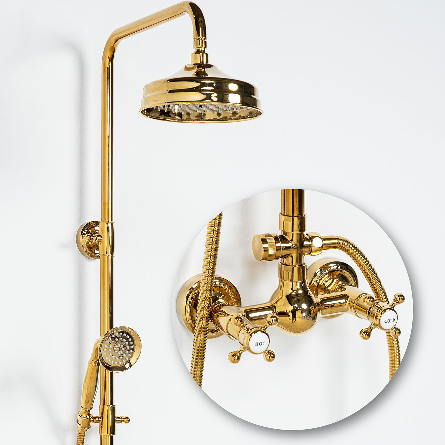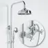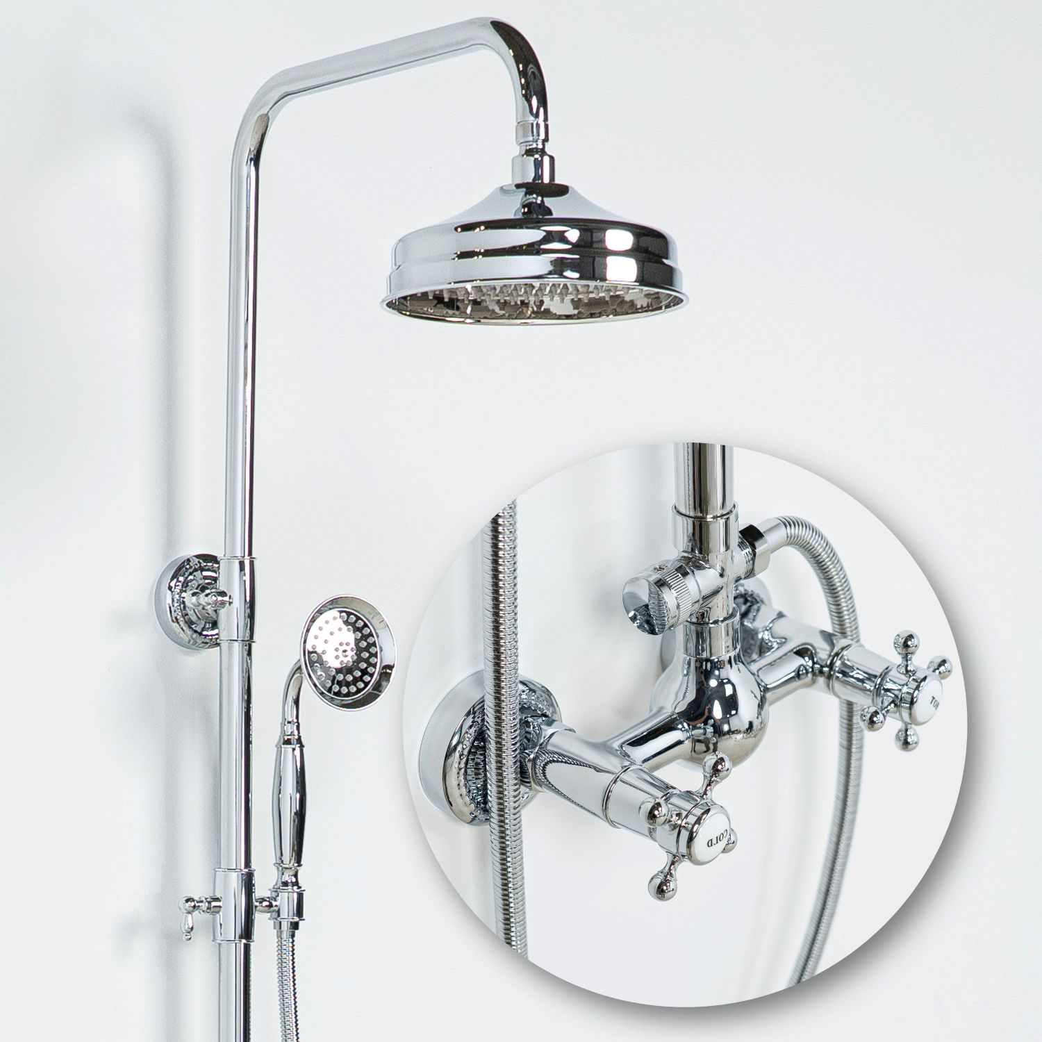 Takduschset Kensington i klassisk design, ett komplett set med takdusch, handdusch och blandare. Tvågreppsblandare med två klassiska korshandtag ger separat reglering av kallt och varmt vatten. Tillverkat i gedigen mässing med elegant finish som passar i både sekelskifteshem och badrum med klassisk inredning.
