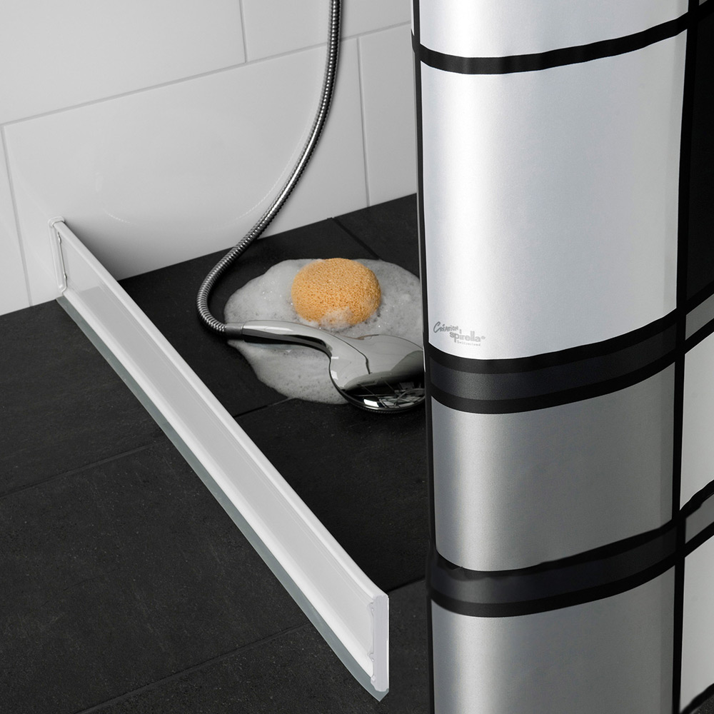 Handy duschsarg "dusch och vänd" är lika enkel som genial. Duschsargen är tillverkad av aluminiumprofil som ligger löst mot golvet och håller vattnet på plats när man duschar. Efteråt läggs duschsargen mot väggen där den inte är i vägen. Sargen är utrustad med gummilist för effektiv tätning. Duschsargen finns i vitlackad eller naturanodiserad aluminium. (Duschsargen kan också kallas duschkant,duschsockel eller duschlist). Duschsargen finns i flera olika modeller, vinklad, u-formad och rak. Den raka modellen finns med liten kantvinkel som står själv eller helt rak profil som används tillsammans med väggfäste. Profilhöjd 100mm. Denna artikel är den raka profilen och måste fästas i väggen med väggfäste.