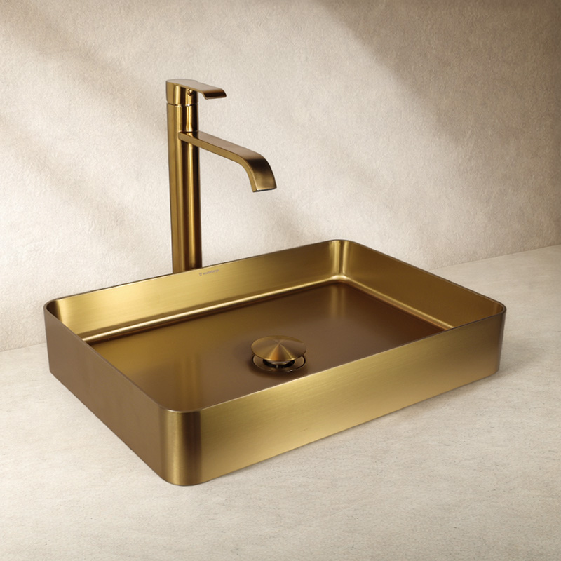 Westerbergs Tinca är ett fristående rektangulärt handfat med tunna kanter och rundade hörn. Tillverkad i borstat rostfritt stål. Bottenventil ingår. PVD-ytbehandling för hållbar nyans. Kombinera med hög blandare.