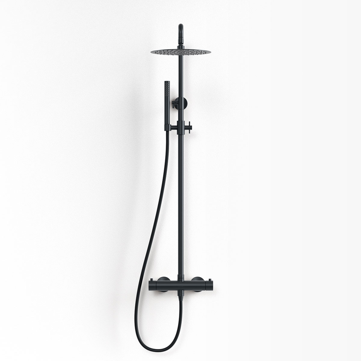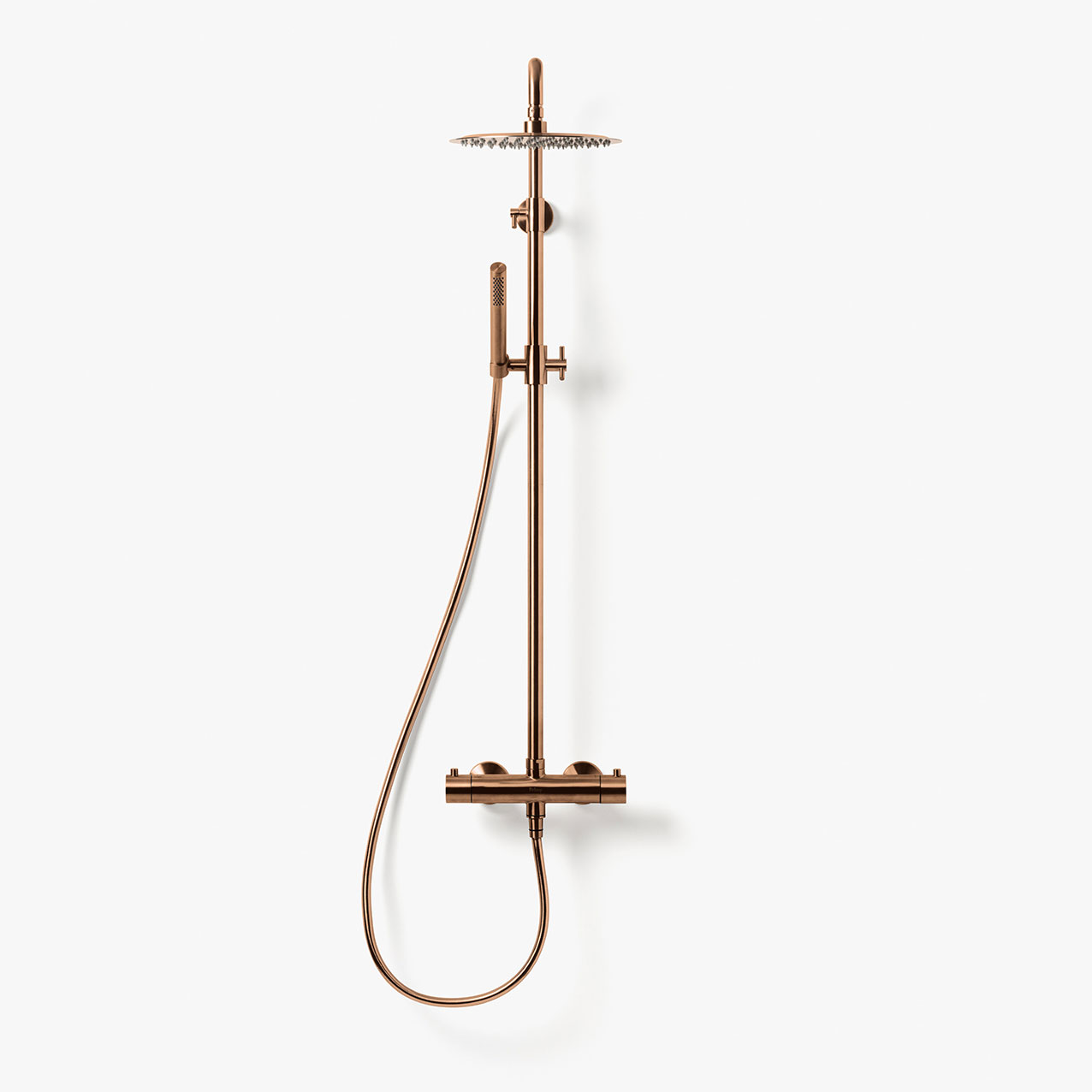 Den i höjdled justerbara takduschen ger ett rikligt men mjukt vattenflöde och har vinklingsbar taksil för maximal komfort. Tack vare antikalksystement Easy-Clean i tak- och duschmunstycke håller du enkelt kalkavlagringar borta genom att gnugga gummidelarna ett par gånger om året.Infärgningen till varianterna Brushed Brass, Brushed Bronze och Matte Black sker via PVD-teknik vilket gör ytan många gånger starkare än till exempel krom och vanlig lackering. De ofärgade varianterna Brushed Stainless och Polished, med borstad respektive handpolerad yta, kommer i sin naturliga kulör som är något varmare än traditionella mässingsblandare med kromad yta – och betydligt tåligare. I varianten Polished kommer duschslangen med ett lager twillvävd svart nylon som förstärker det exklusiva utseendet. För övriga finishar kommer duschslagen i samma kulör som blandaren.Vi rekommenderar dold montering av väggdosa 150 c/c. Använd medföljande täckkåpor. Se fler installationsalternativ under Fakta.