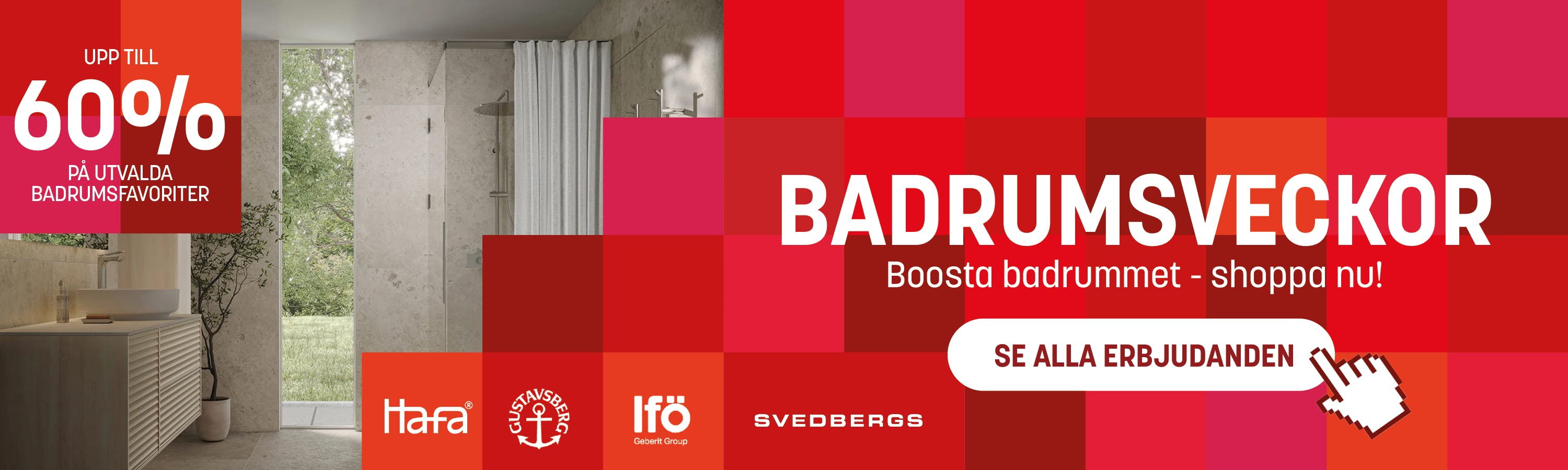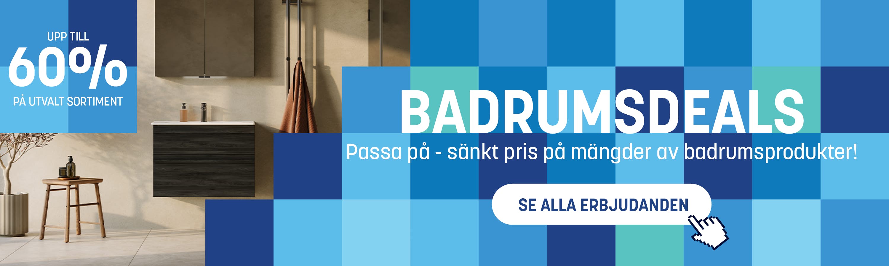 Det stora sortimentet av kakel, mosaik och klinkers ger oändliga möjligheter att skapa ramen till ett äkta drömbadrum. Numera är även trä ett alternativ för den som söker ett vackert och levande material. Här finns inga begränsningar. Oavsett vilken färg eller stil du är ute efter till ditt badrum har vi ett stort sortiment med allt för svart badrum och vitt badrum. Välj efter behag en ångande duschkabin med en mängd funktioner och/eller ett badkar i valfri stil, alltifrån modernaste bubbelbadkar till klenoder med lejontassar.