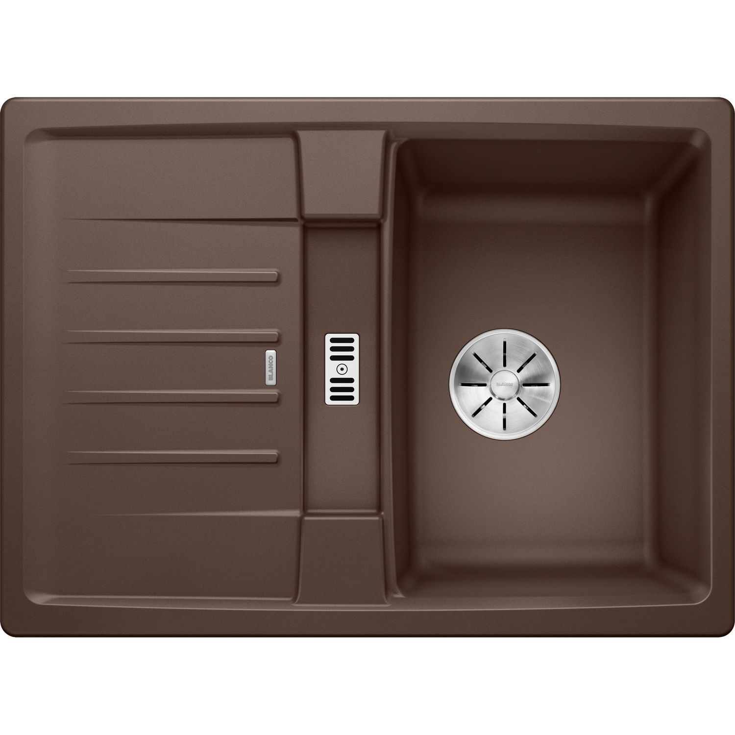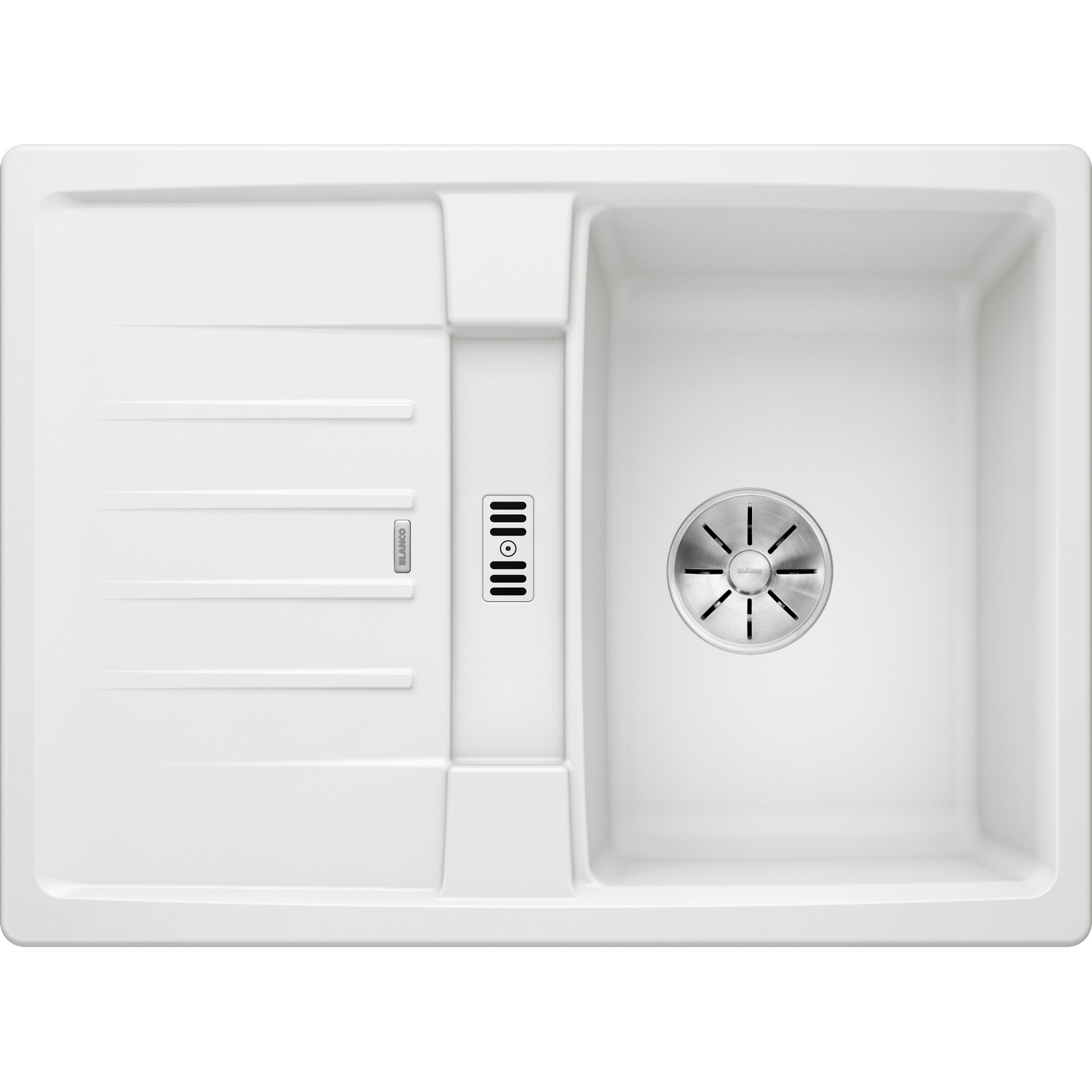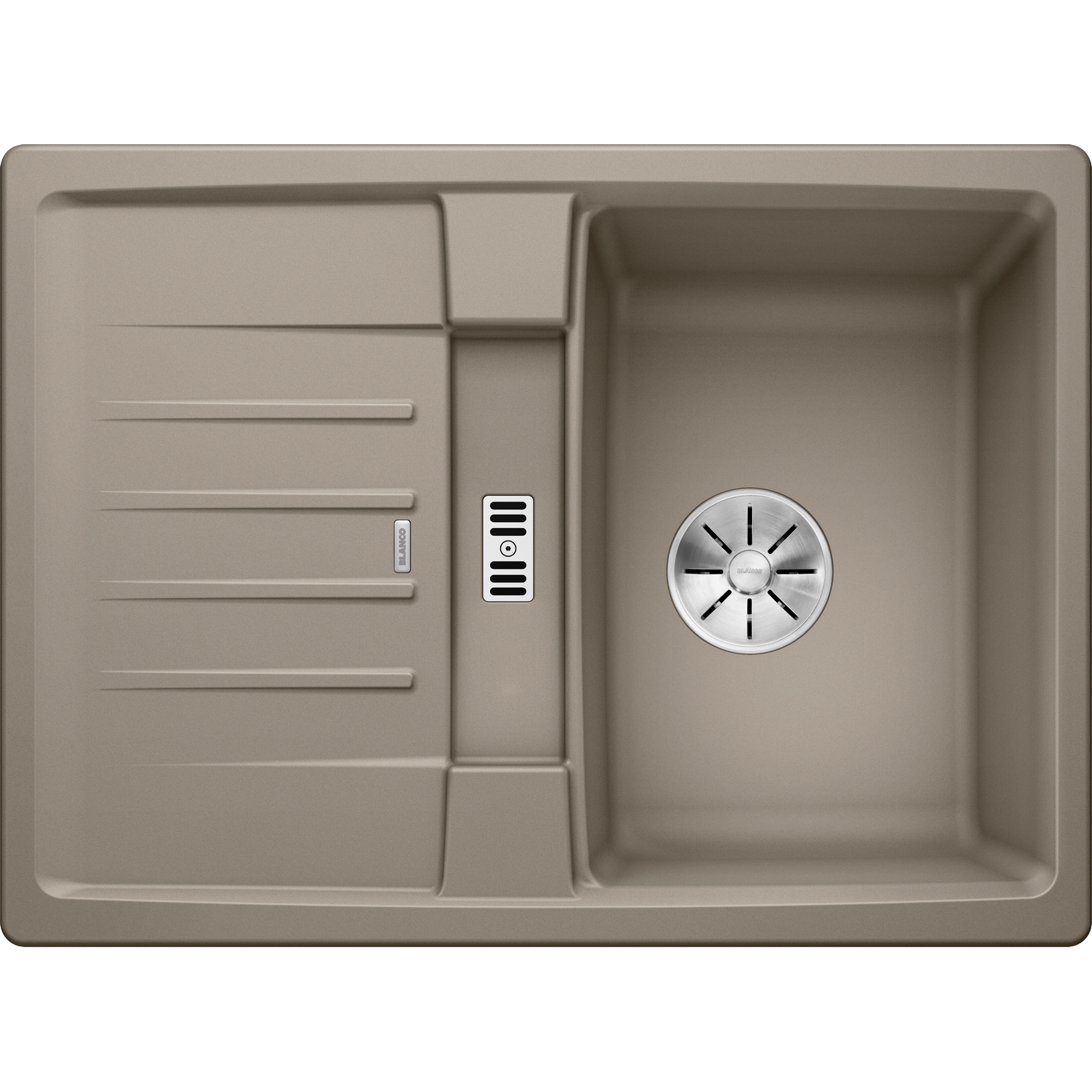 Diskbänken har breddavlopp och Blancos patenterade InFino-avloppssystem med elegant utformad korgventil.