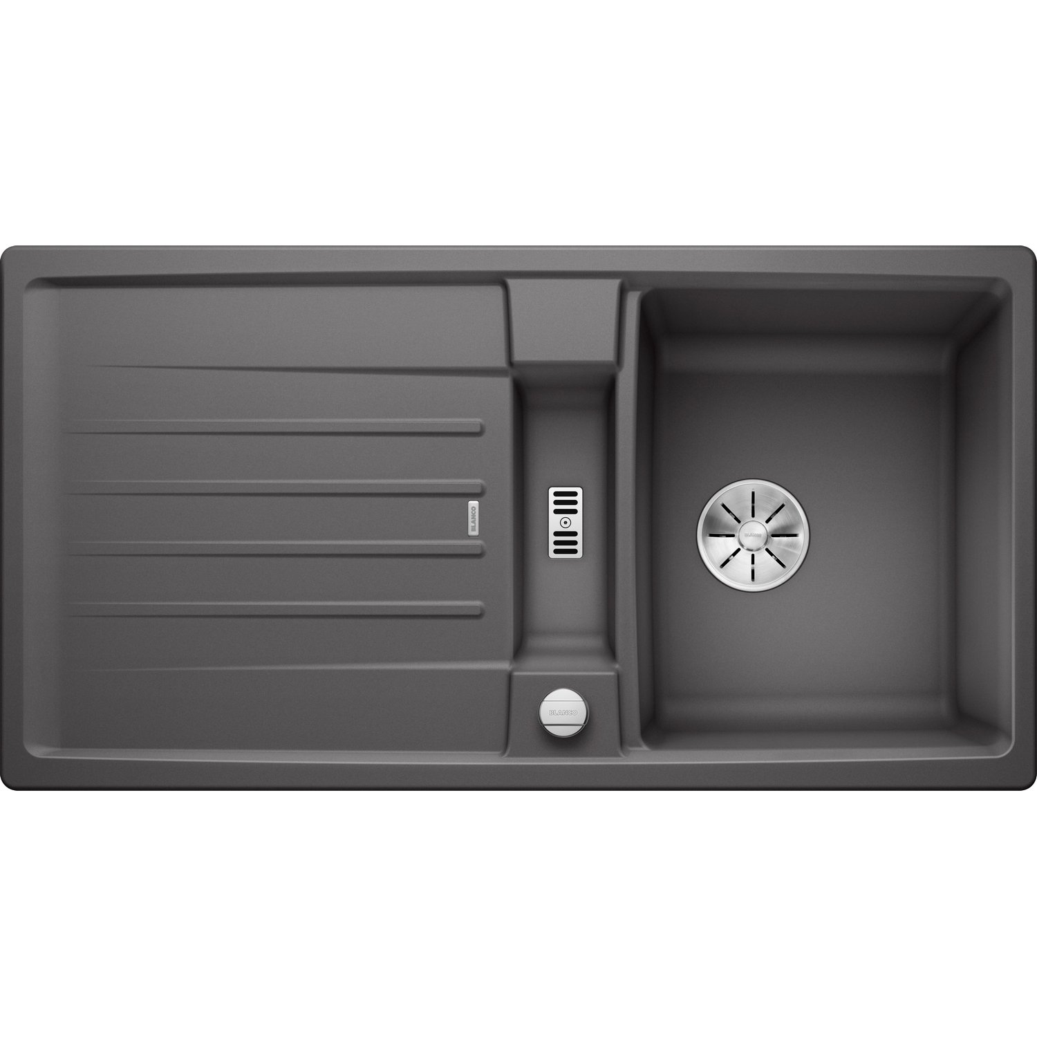 Diskbänken har breddavlopp och Blancos patenterade InFino-avloppssystem med elegant utformad korgventil. Den har dessutom ett vred för öppning/stängning av bottenventilen.