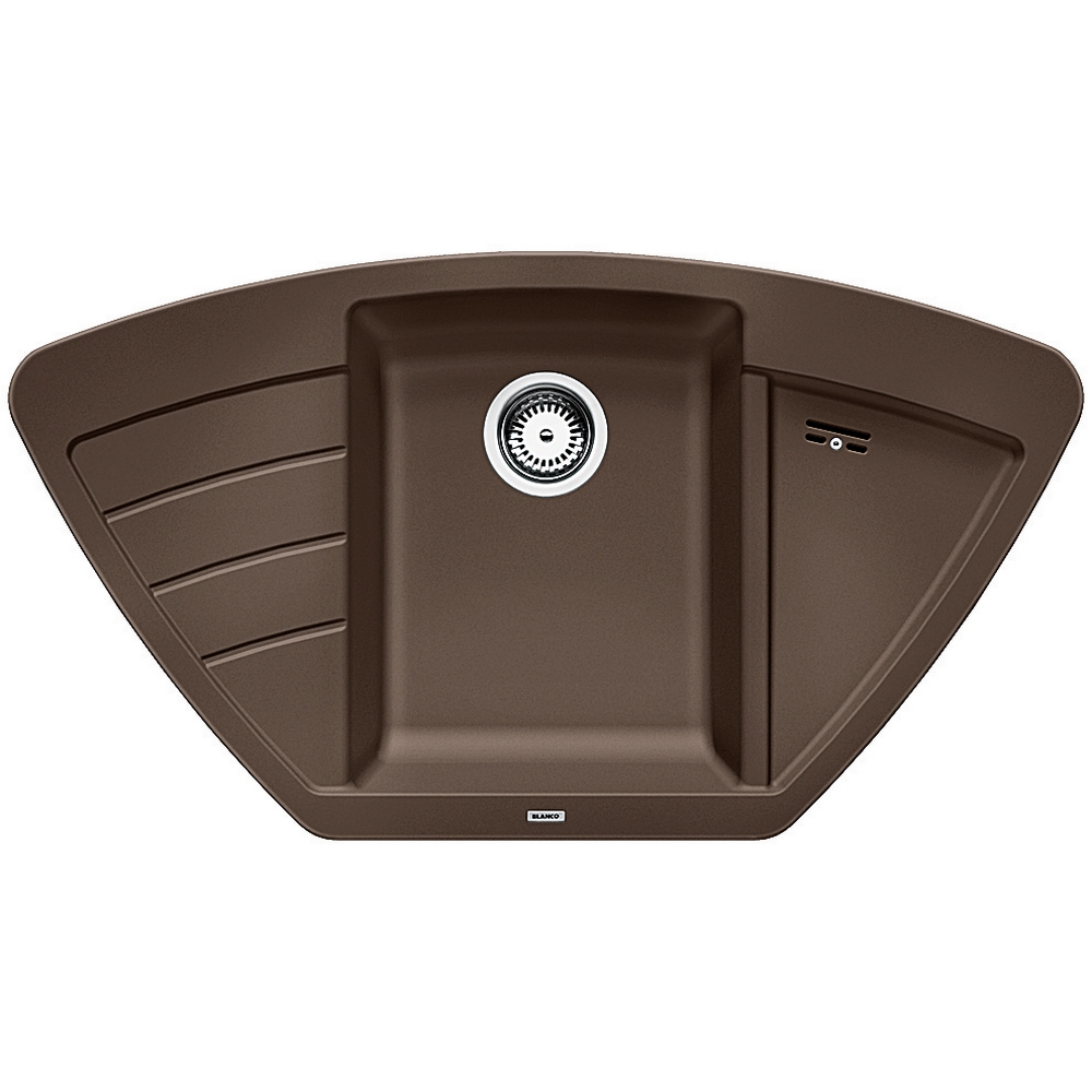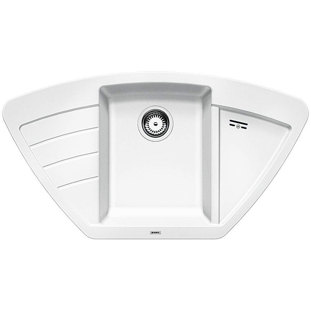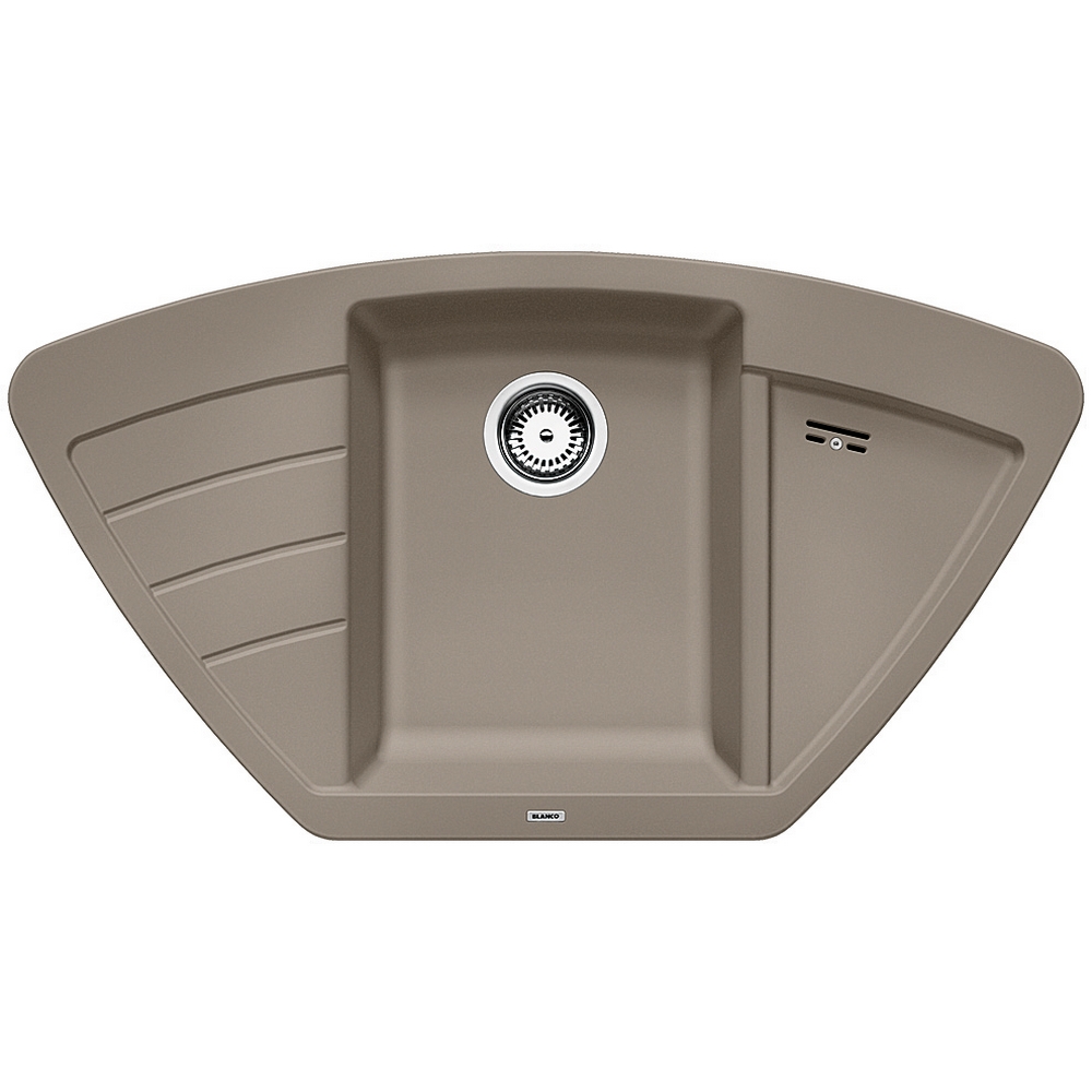 HörnBlanco Zia 9 E är en stilren hörndiskbänk av silgranit. Den har 3½" avlopp med korgventil, en avställningyta och en avrinningsyta.