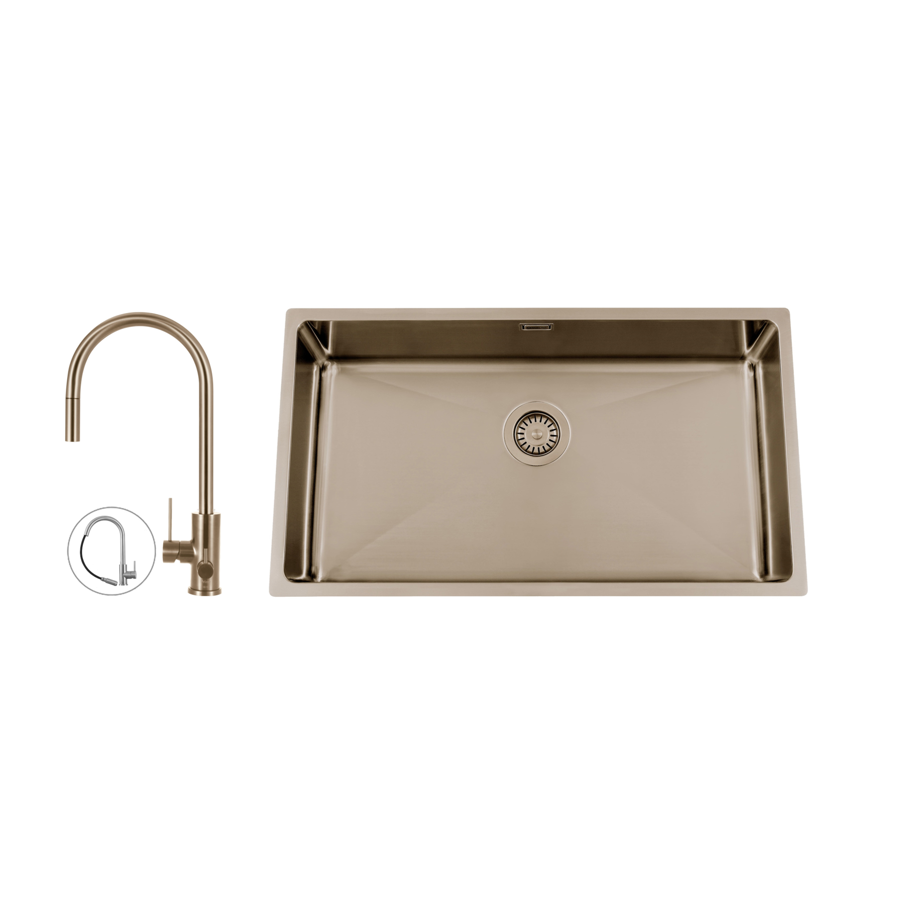 Disklåda Nordic Tech Titan 730 X med Köksblandare Steel Accent D är en kraftig disklåda i 1,2 mm rostfritt stål med snyggt borstad yta för min 800 mm skåp i kombination med en stilren köksblandare från Primy.
