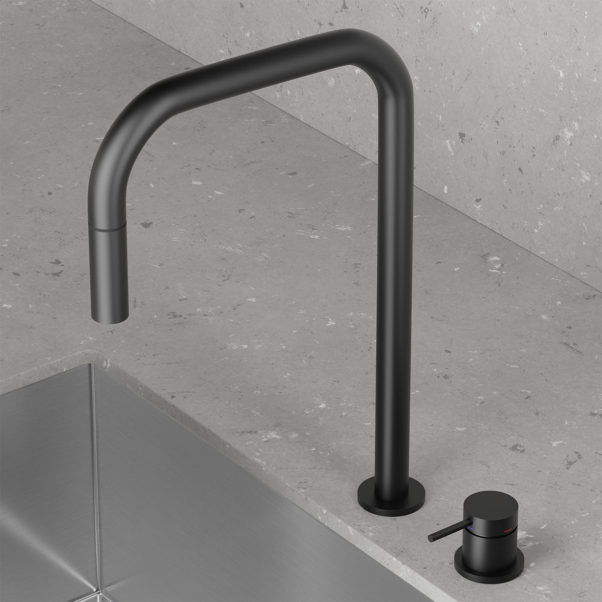 Köksblandare Scandtap Harmonized K2P Square med separat pip och vred. Avskalad slim design där mjuka former och raka linjer samspelar och förhöjer. Avstånd och vinkel mellan handtag och pip kan anpassas efter personlig smak och behov. Formgiven med ett diskret utdragbart munstycke för smidig rengöring. Ett designelement med både subtil och utsökt närvaro.
