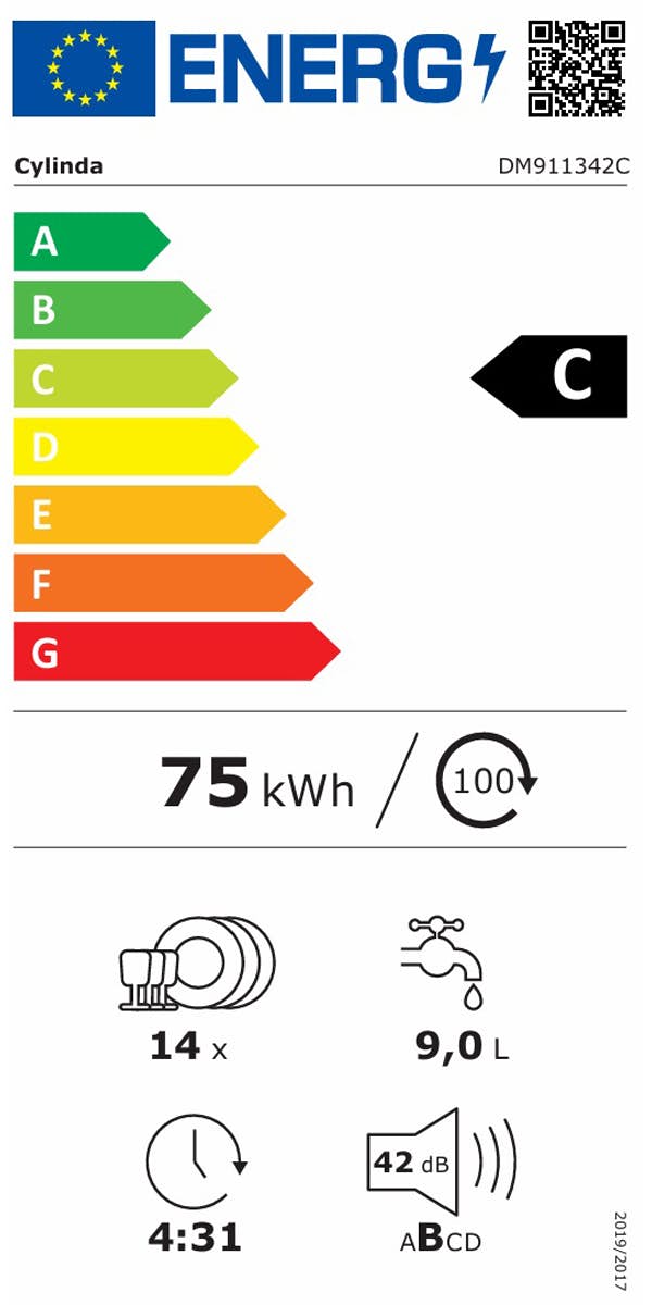 Diskmaskin DM911342C från Cylinda har tre korgar med plats för 14 kuvert och en ljudnivå på endast 42 dB. Den tysta driften gör modellen väl lämpad för öppna köksmiljöer där låg ljudnivå är en viktig fördel.