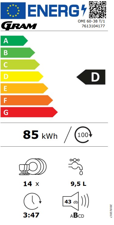 GRAM OMI 60-38 T1 är en högkvalitativ diskmaskin med en kapacitet på 14 kuvert. Detta betyder att maskinen klarar av att diska en stor mängd tallrikar, bestick och glas på en och samma gång. Med en ljudnivå på bara 43 dB(A) passar denna diskmaskin perfekt till öppna kök eller kök-/allrum.