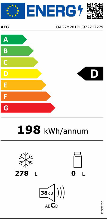 AEG 7000 NoFrost är energiklass D, vilket gör den till ett energieffektivt alternativ. Med en ljudnivå på endast 38 dB(A) är den även tystgående, vilket gör den perfekt för öppna planlösningar och moderna kök. Frysskåpet har dessutom 10 års garanti på kompressorn, vilket garanterar långvarig prestanda och trygghet.