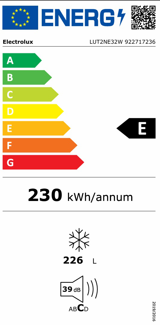 Med en energiklass E och en årlig energiförbrukning på 230 kWh är denna fristående frys energieffektiv och håller nere elförbrukningen. Tystgående prestanda med en ljudnivå på endast 39 dB(A) gör den perfekt för öppna kök och hem där ljudnivån spelar roll. Dessutom har frysen en säkerhetsfunktion vid strömavbrott, vilket innebär att dina livsmedel håller sig frysta i upp till 10 timmar om strömmen skulle gå.