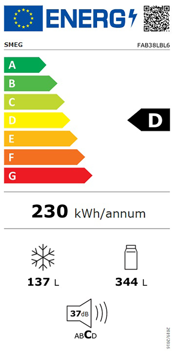 Med en inverterkompressor, köldmedium R600a och ett årligt energibehov på endast 230 kWh är FAB38RCR6 både tyst och energisnål. Ljudnivån är så låg som 37 dB(A), vilket gör att skåpet knappt märks i ett öppet kök. Energiklassen är D enligt den nya energimärkningen och bullerutsläppet klassas i kategori C.