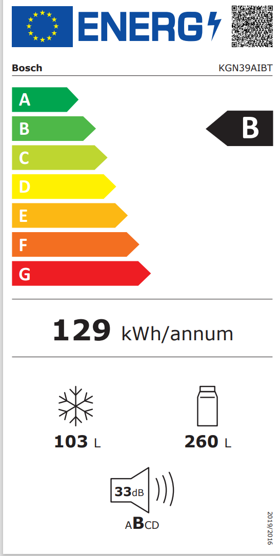 - Genomsnittlig årlig energiförbrukning i kilowattimmar (kWh/a): 129 kWh/annum