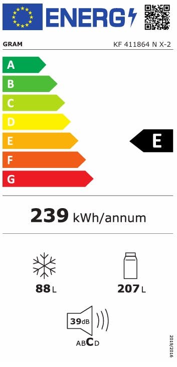 En stilren kyl/ frys KF 411864 N X från Gram rostfri kyl/frysskåp i energiklass E och NoFrost för automatisk avfrostning.