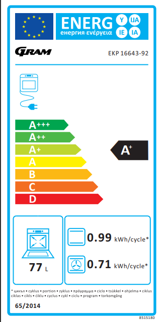 Låg energiförbrukning med en ugn i energiklass A får du låg energiförbrukning. Det är bra för miljön, samtidigt som du sänker din elräkning. Extra stort ugnsutrymme Ett extra stort ugnsutrymme på 77 liter ger dig stor kapacitet att laga mat till hela familjen. Du får dessutom extra stora bakplåtar och ända upp till sex tillagningsnivåer.
