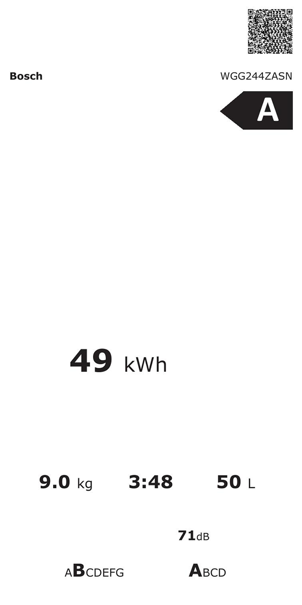 Genom att använda energibesparande hushållsapparater sparar du på värdefulla resurser. Därför bör du väga in låg energi- och vattenförbrukning när du köper en hushållsapparat. Energimärkningen visar tvättmaskinens effektivitetsklass (från A till G), ljudnivå, kapacitet samt energi- och vattenförbrukning. Tack vare vårt extra effektiva energibesparingssystem uppnår Boschs tvättmaskiner kraven för den bästa energiklassen, A, vid varje tvätt utan att kompromissa med resultaten.