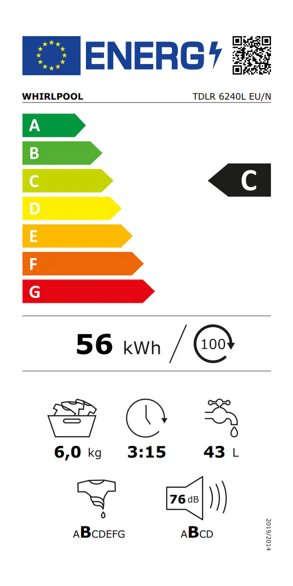 - Vägd energiförbrukning i kWh per 100 tvättcykler för ekoprogram 40-60: 56