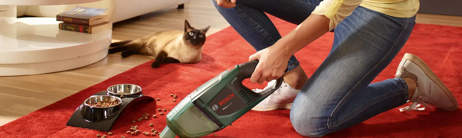 Lätt handdammsugare från Bosch som även fungerar som golvdammsugare. Är lämplig för mobil användning i bilen eller huset. Det extra långa fogmunstycket gör att EasyVac passar utmärkt för svåråtkomliga ställen. Batteriladdningsnivåindikatorn visar hur laddat batteriet är samt hur mycket tid det är kvar. Dammsugaren levereras med flera tillbehör såsom borstmunstycke, fogmunstycke, golvmunstycke, 2 förlängningsrör, filterenhet och tillbehörshållare.
