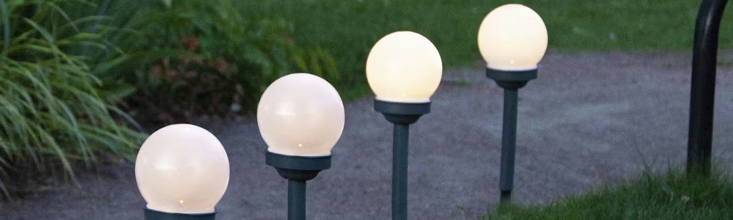 Detta solcellspaket innehåller fyra solcellsdrivna glober som är tio centimeter i diameter. Lamporna är konstruerade så att de enkelt kan stickas ner i marken eller i en kruka på balkongen. Lamporna har ett varmvitt sken och tänds automatiskt vid mörker.