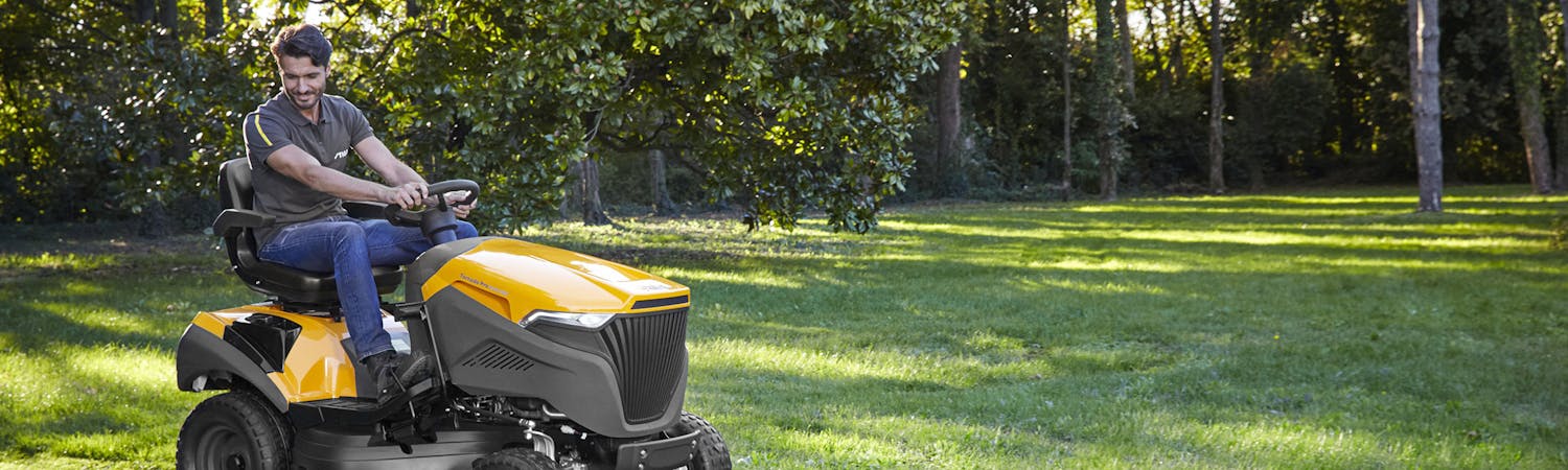 Trädgårdstraktor med enkel hastighet- och riktningskontroll med pedalmanövrerad hydrostatisk transmission. Verktygslös justering av sätets position, ergonomiskt placerade spakar, intuitiva pedaler sida vid sida och fjäderunderstödda klippaggregat. Klippdäcket är utrustat med stödhjul ("antiskalp"), vilket minskar risken för att förstöra gräsytan vid ojämnt underlag. Utrustad med dragkrok bak och dubbla strålkastare fram. Enkel att starta tack oavsett väder, tack vare den automatiska choken. Säker och bekväm åtkomst till klippning när du backar genom att vrida startnyckeln ett hack.