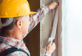 14. För att få ett jämnt och fint underlag att måla eller tapetsera på behöver du spackla alla skarvar där gipsskivorna möts. Sätt en självhäftande glasfiberremsa över skarvarna och spackla sen med en bred spackelspade så att spacklet räcker hela remsan och en bit över på båda sidor. När spacklet torkat slipar du ytan för att få bort eventuella ojämnheter. Spackla och slipa en gång till vid behov.