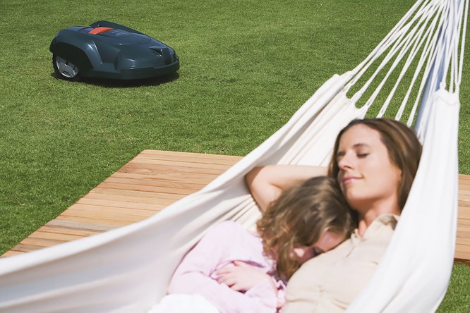 -Köper du den hos oss i butiken i Stockholm kan vi hjälpa till med installationen, annars är tanken att du ska kunna installera den själv. Förutsatt att du läser bruksanvisningen så är det inte komplicerat. Först lägger du en begränsningsslinga runt området den ska klippa, den kan du häfta fast ovanpå gräsmattan om du vill. Efter 3–4 veckor har kabeln ätit sig neråt och du ser den inte längre. Kabeln ska ligga med 30 centimeters avstånd från fasta föremål, så som husfasaden, 20 centimeter från rabattkanter och 10 centimeter från plattor som ligger dikt an gräsmattan, om du har sådana. Kan du mäta dessa mått klarar du av installationen! Sedan sätter du ut laddstationen. Den kräver ett 220 Volts eluttag, och har du ett sådant på altanen kan du ta el därifrån. Sedan är det bara att sätta sig i hammocken och njuta.