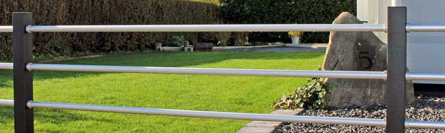 Med Arkad kombinerar du metall och trä. Stolparna finns olika färger och kan användas till staket, räcke eller avskärmning. De liggande träreglarna ger ett modernt intryck.