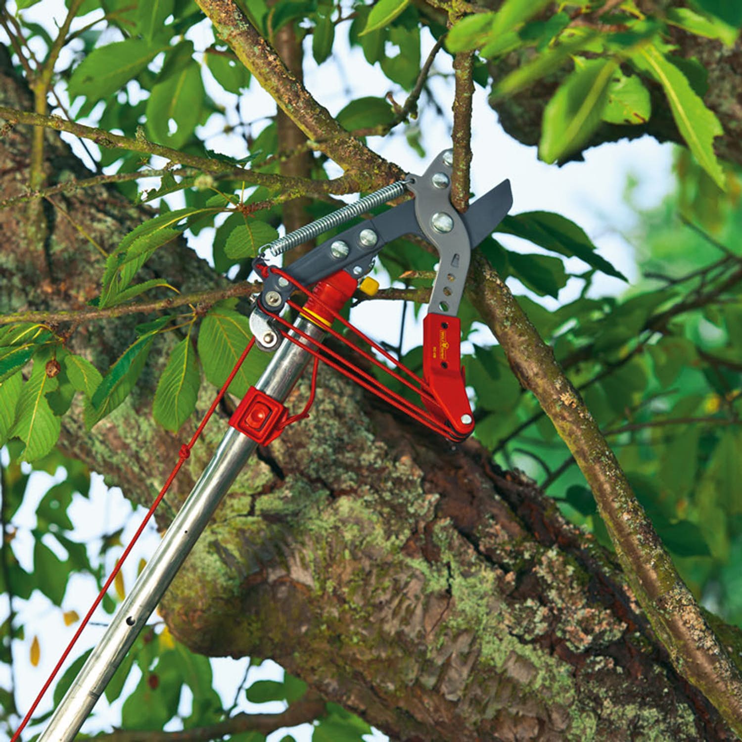 En stångsax som klipper tjocka grenar effektivt. Med hjälp av ett teleskopskaft kan du dessutom beskära träd upp till 5,5 meter ovanför marken utan stege. Denna stångsax är vinklingsbar upp till 180°, vilket gör att du bättre kan kontrollera hur snittet genomförs. Med hjälp av den medföljande snörguiden hålls snörlinan på plats medan du klipper och förflyttar dig runt trädet. Flera av delarna är utbytbara. Teleskopskaft ingår ej, men kan köpas till.