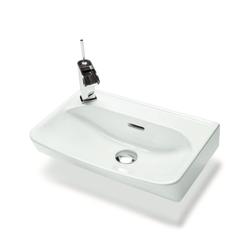 Ett tvättställ med unik design, där blandaren monteras på sidan. Mjuka runda kanter i klassiskt vitt porslin och överfyllnadsskydd. Kan monteras på väggen med konsolmontage, men passar även på kommod. Finns att beställa i flera storlekar och djup och hittas även i en klassisk modell där blandaren monteras i mitten.
