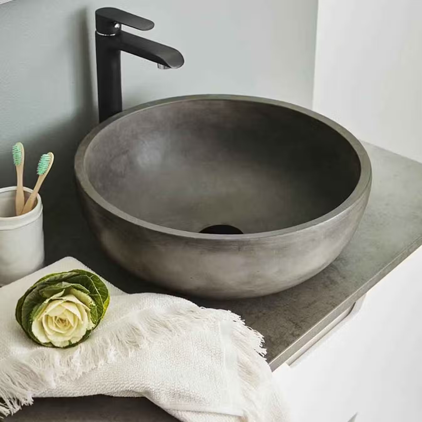Ett fristående, stilrent handfat som passar perfekt i det moderna badrummet. Handfatet är tillverkat i gjuten betong, vilket för varje exemplar unikt med variationer i kulör och yta. Insidans yta är förseglad för att stänga betongens porer och gör den därför mer fläckbeständig.