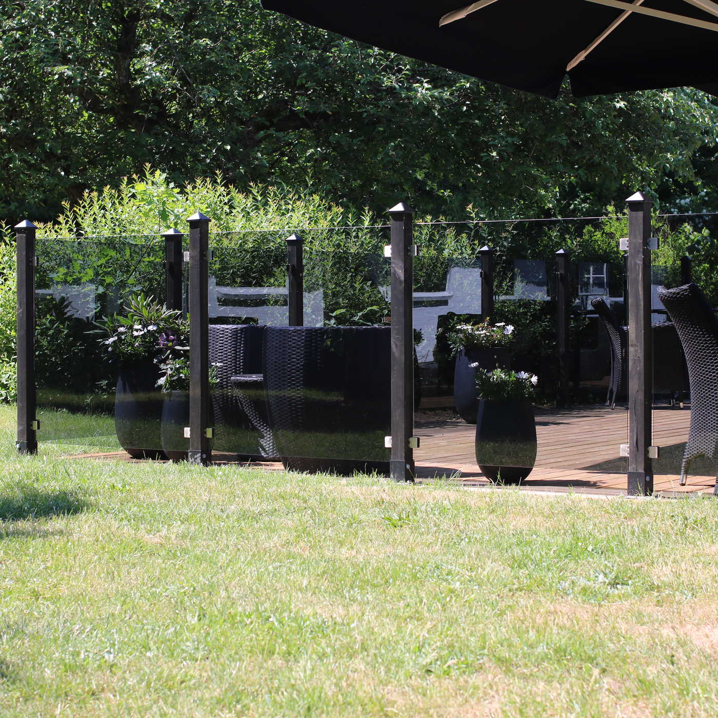 Glasstaket inkl. monteringsbeslag. HORTUS glasstaket är ett vackert och tidlöst staket, som skärmar av för vinden och samtidigt bevarar den rymliga känslan i din trädgård. Staketet kan monteras på rad, i L- eller U-form och är enkelt att montera. Glaset är rökfärgat i 6 mm tjocklek och härdat, och varje element levereras inkl. 4 st. stålbeslag redo att monteras på trästolpar. De medföljande stolparna är grundmålade svart samt impregnerade till jordkontakt. Staketet avslutas fint med en Kokille Pyra 78 svartmålad aluminiumtopp.