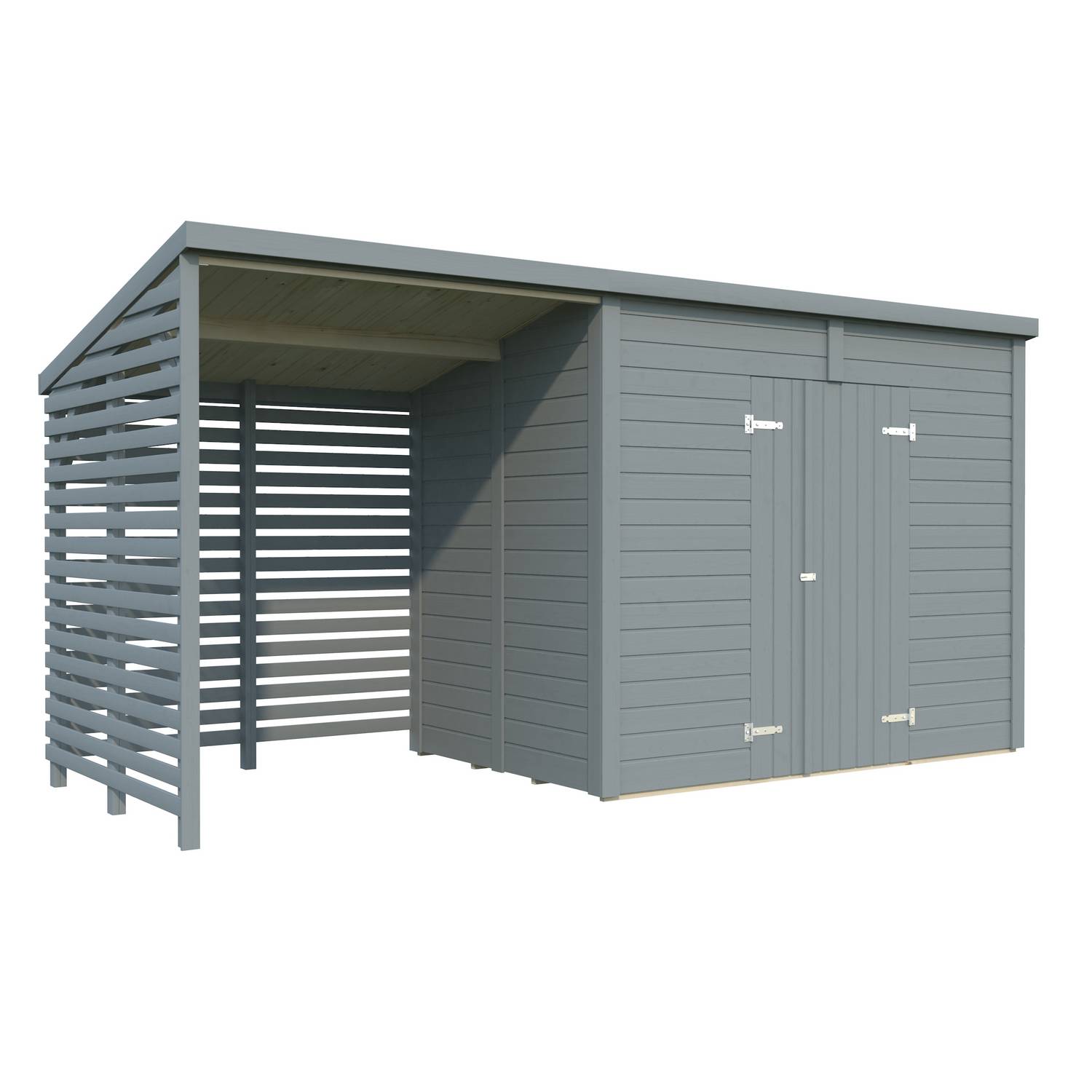 Leif är en praktisk förråd med utbyggnad för förvaring av trädgårdsredskap, gräsklippare, trädgårdsdynor etc. Förrådet är tillverkat av prefabricerade väggelement och är enkelt att montera. Dubbeldörrar på framsidan gör det enkelt att ta in större föremål som trädgårdsmaskiner och trädgårdsmöbler. Praktisk sidobyggnad för förvaring av t.ex. ved, cyklar etc. Levereras som byggsats inklusive golv och alla infästningar.
