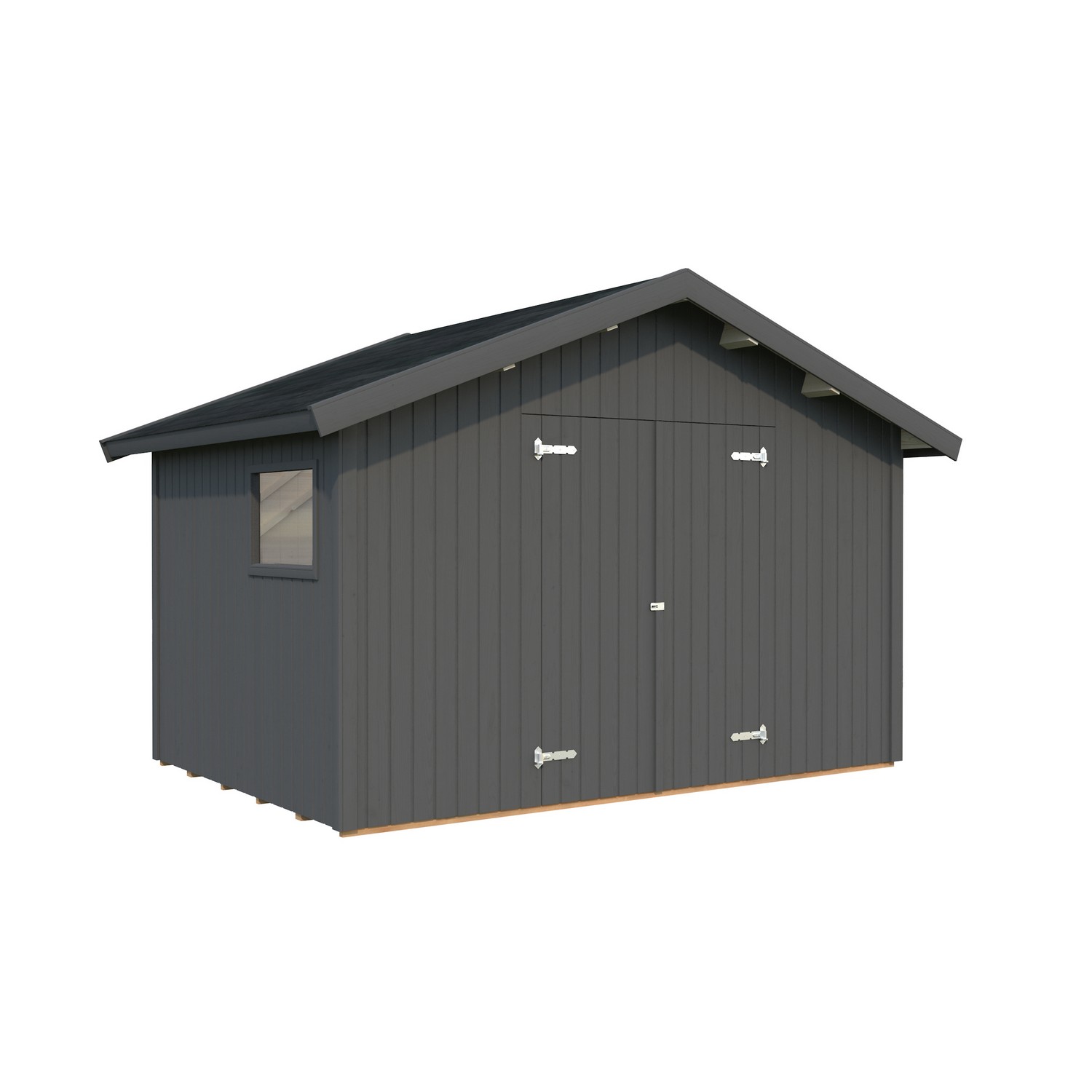Nils är ett förråd med ett fast fönster i plexiglas och en pardörr. Modernt knutförband för en enkel montering.
