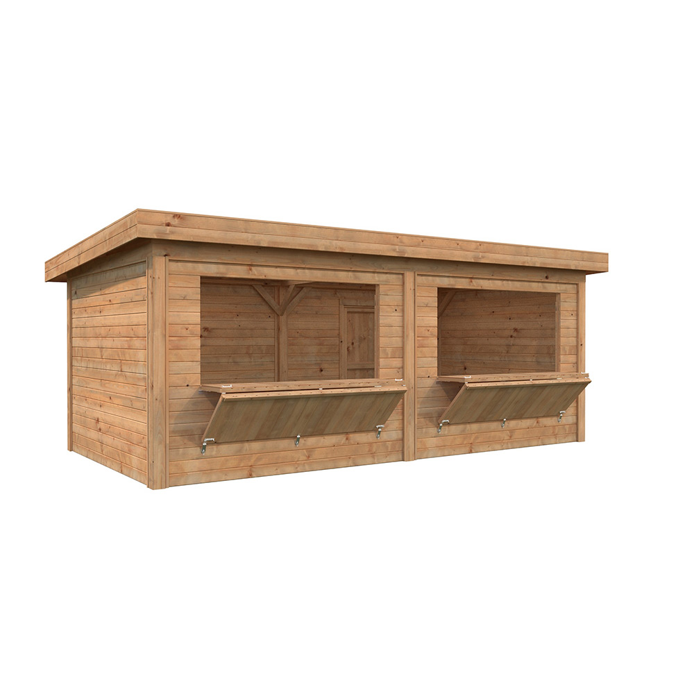 Denna rymliga kiosk med två luckor kan användas på marknader, mässor, idrottsplatser etc.
