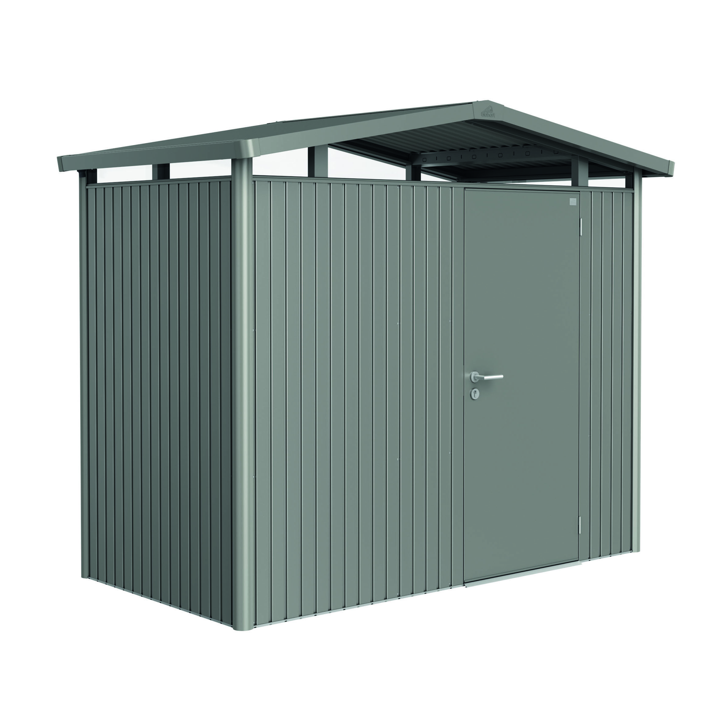 Redskapsbod Biohort Panorama P1 har ett omslutningsfönster av akrylglas som ger ett unikt ljusinsläpp och gör att modellen med sitt moderna gaveltak, passar in bra i