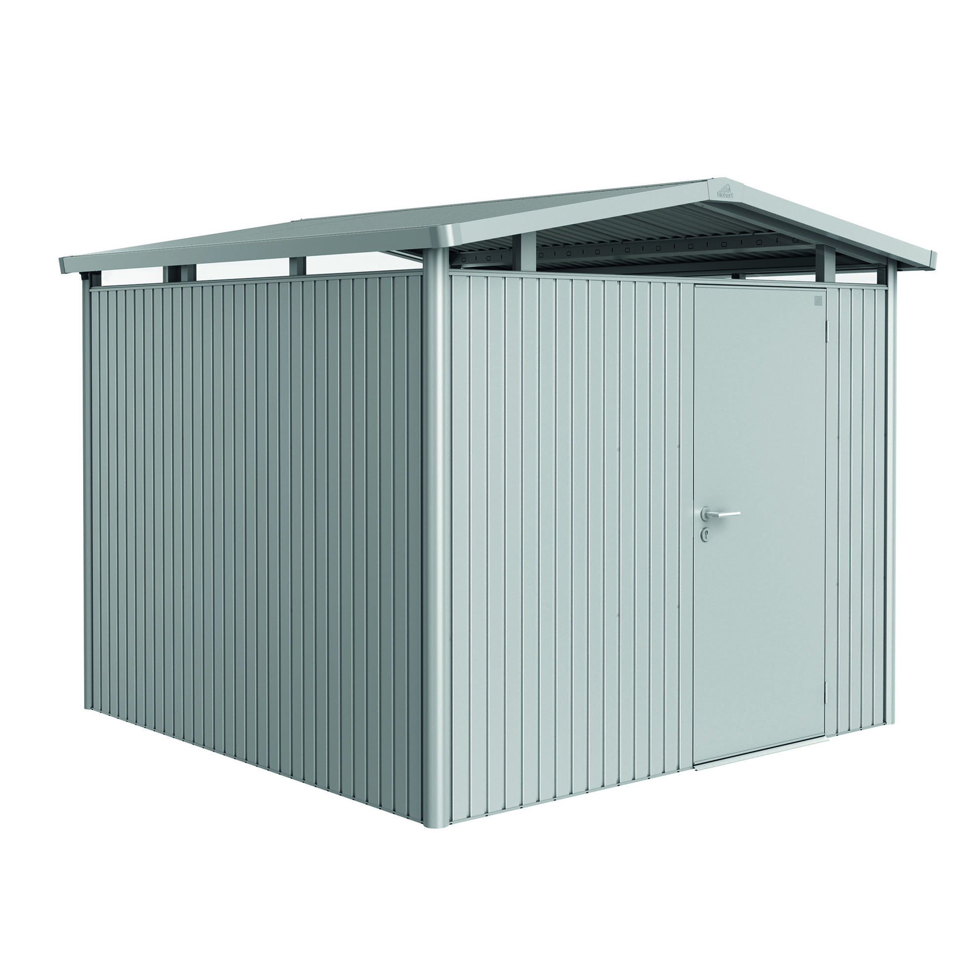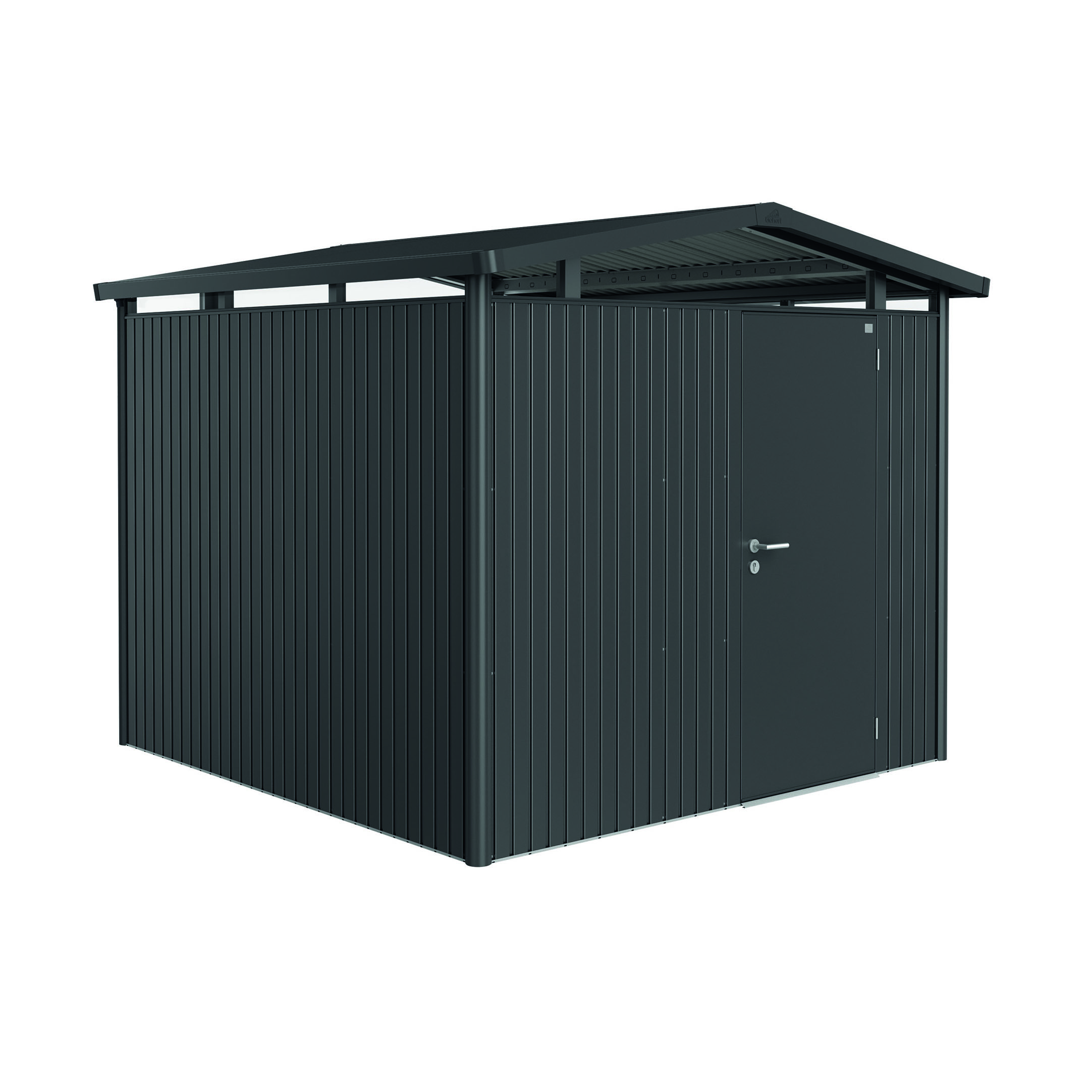 Redskapsbod Biohort Panorama P1 har ett omslutningsfönster av akrylglas som ger ett unikt ljusinsläpp och gör att modellen med sitt moderna gaveltak, passar in bra i
