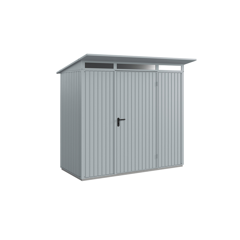 Redskapsbodarna får sin höga stabilitet och slitstyrka av dess stålkonstruktion och den höga materialtjockleken. Grundram i aluminium ingår alltid som standard. Alla skruvar och gångjärn är förzinkade och därmed skyddade mot oxidation. Redskapsbodarna är som standard utrustade med pålitliga dörrlås och högkvalitativa gångjärn. Modellen Modern levereras med integrerat överljus i akrylglas för invändigt dagsljus. Som tillval erbjuds ett stort antal hyllsystem i form av justerbara hyllor, cykelhållare, redskapshållare, belysning, aluminiumgolv mm.