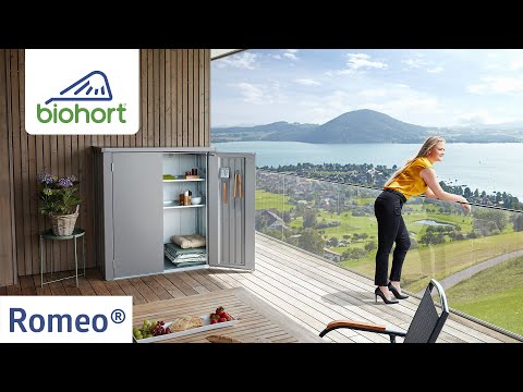 Terrasskåpet Romeo® från Biohort skapar extra utrymme för förvaring och kräver liten yta. Det passar perfekt för balkong- och terrassentusiaster med ett individuellt hyllprogram, dörrar som stängs med gasdämpare och övriga funktioner.