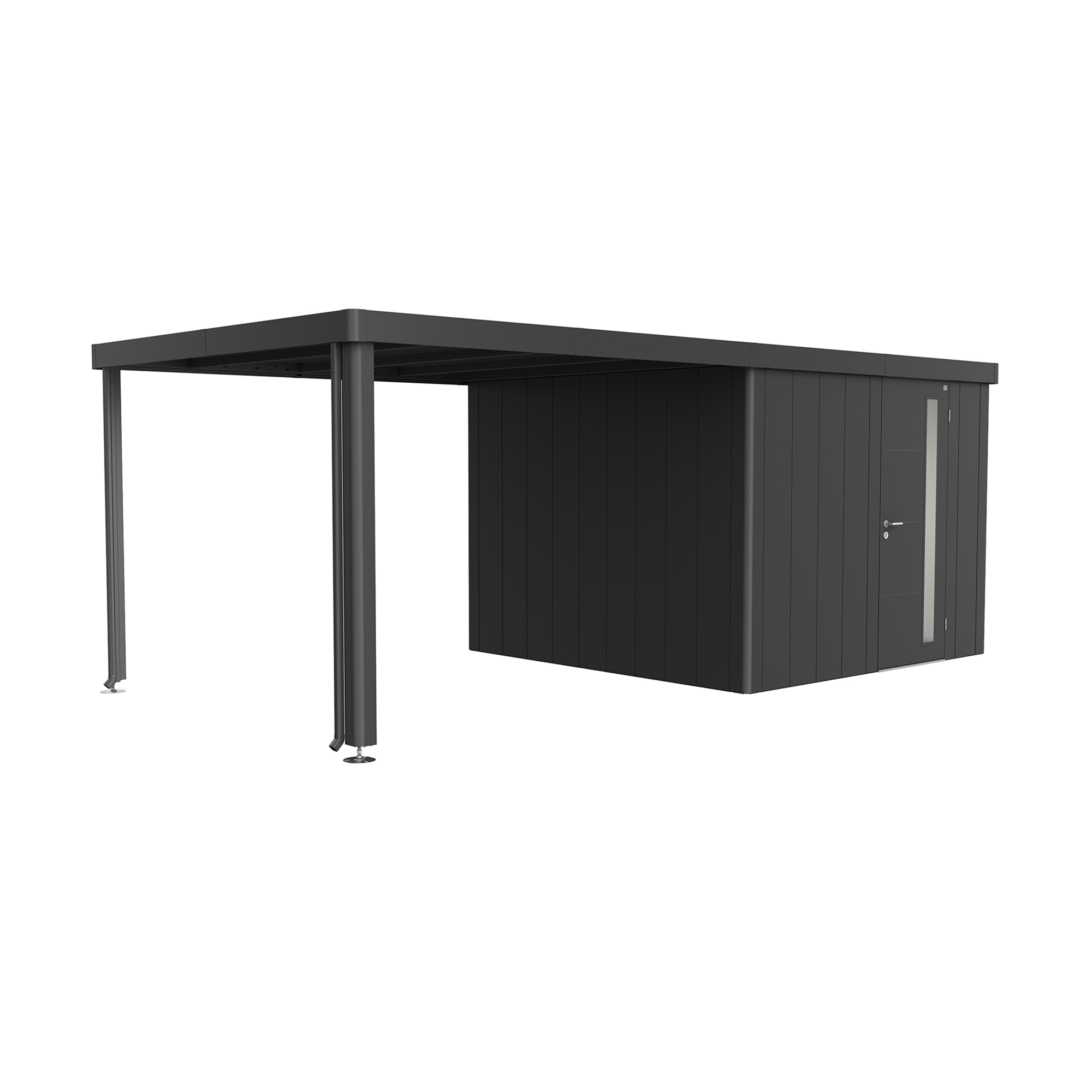 Sidotaket passar till trädgårdsskjul från Biohort av modellen Neo 3A/3B/3C/3D. Sidotaket kan fästas på antingen på ena eller båda sidorna. Stödbenen i aluminium är utrustade med höjdjusterbara fötter. Två stuprör medföljer.