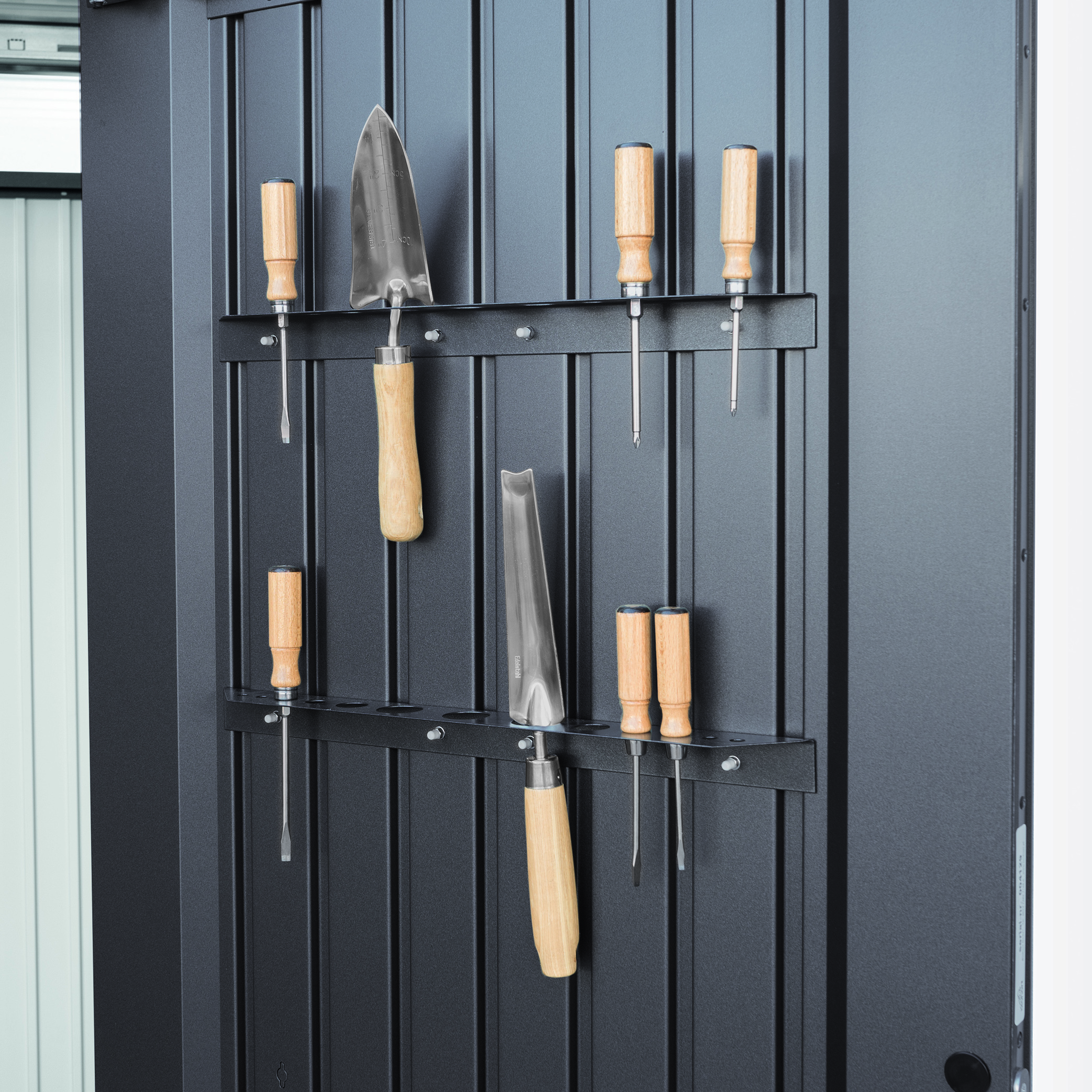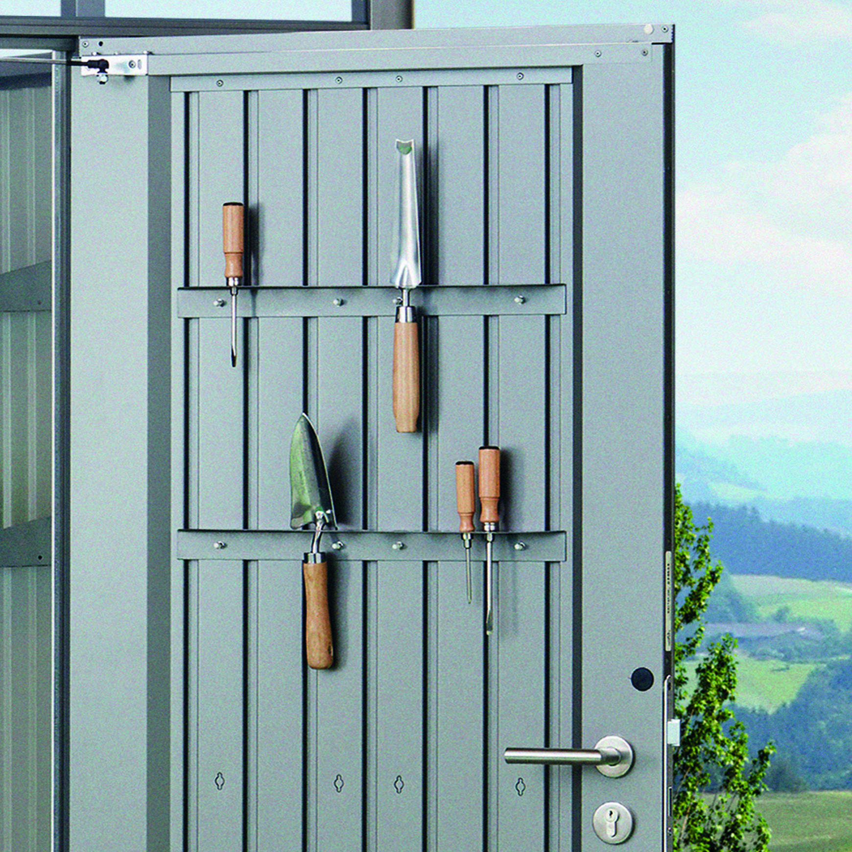 Verktygshållare från Biohort som fästs på dörren för att hänga undan spadar, krattor, trädgårdsslangar och andra verktyg.