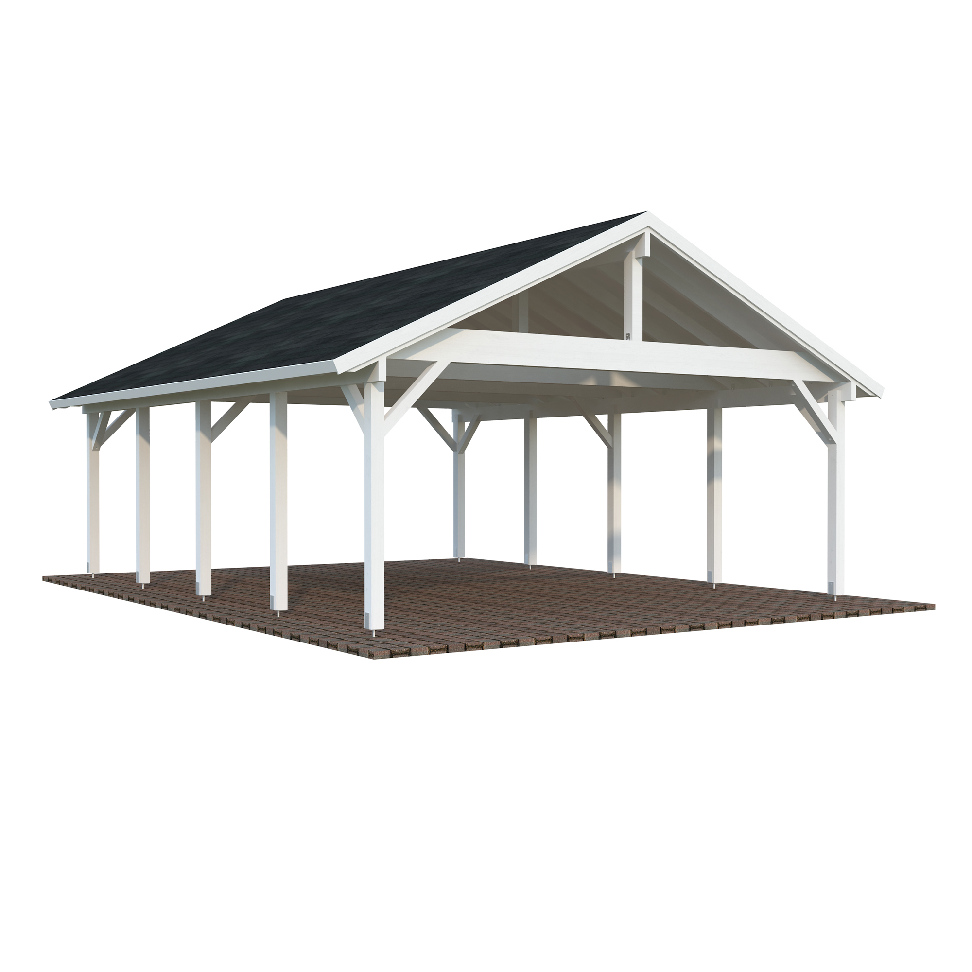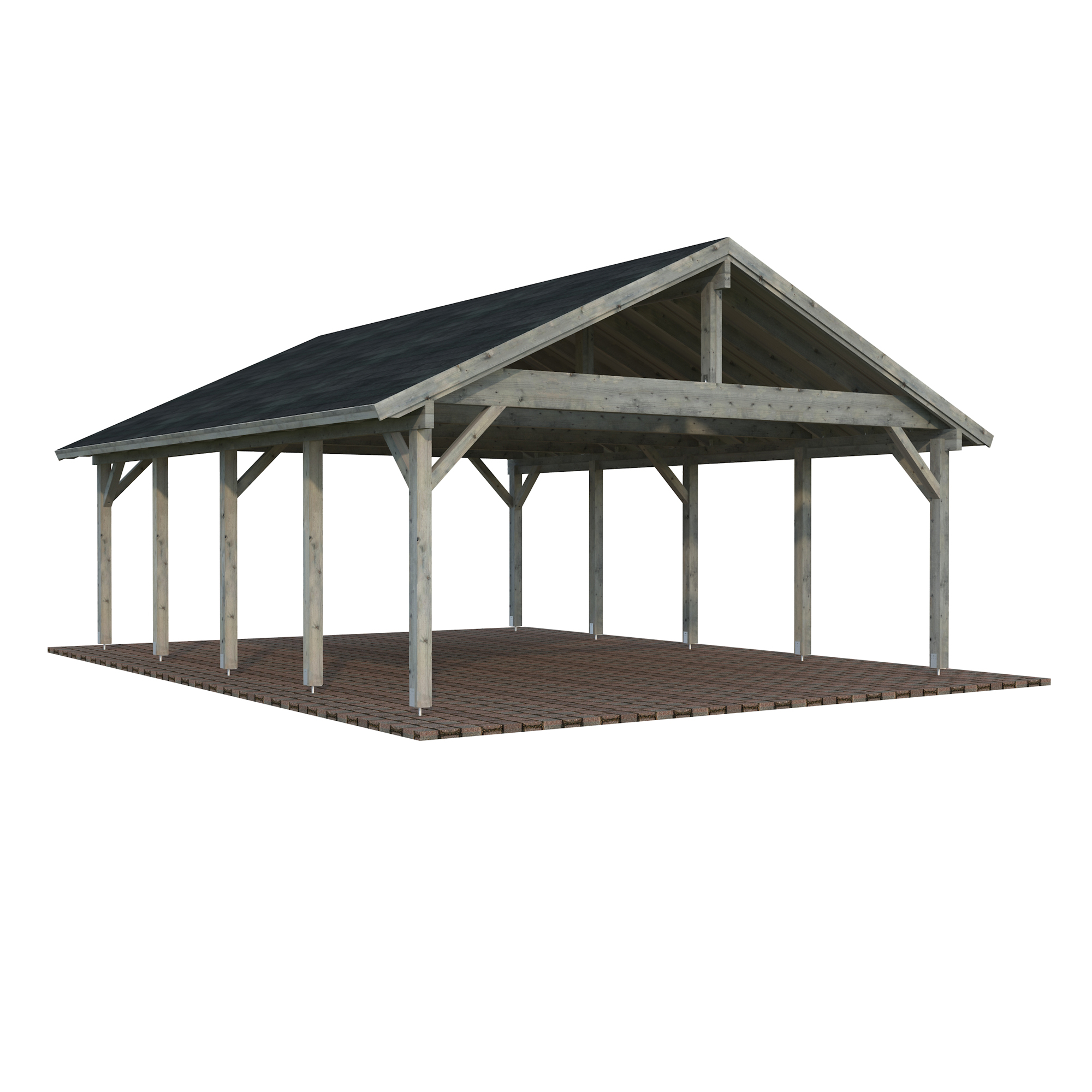 Palmakos Robert 40,6 m² är en klassisk carport med tio kraftiga stolpar och sluttande tak som smälter in bra med omkringliggande hus. Denna variant av Robert är en dubbel carport med plats för två bilar.