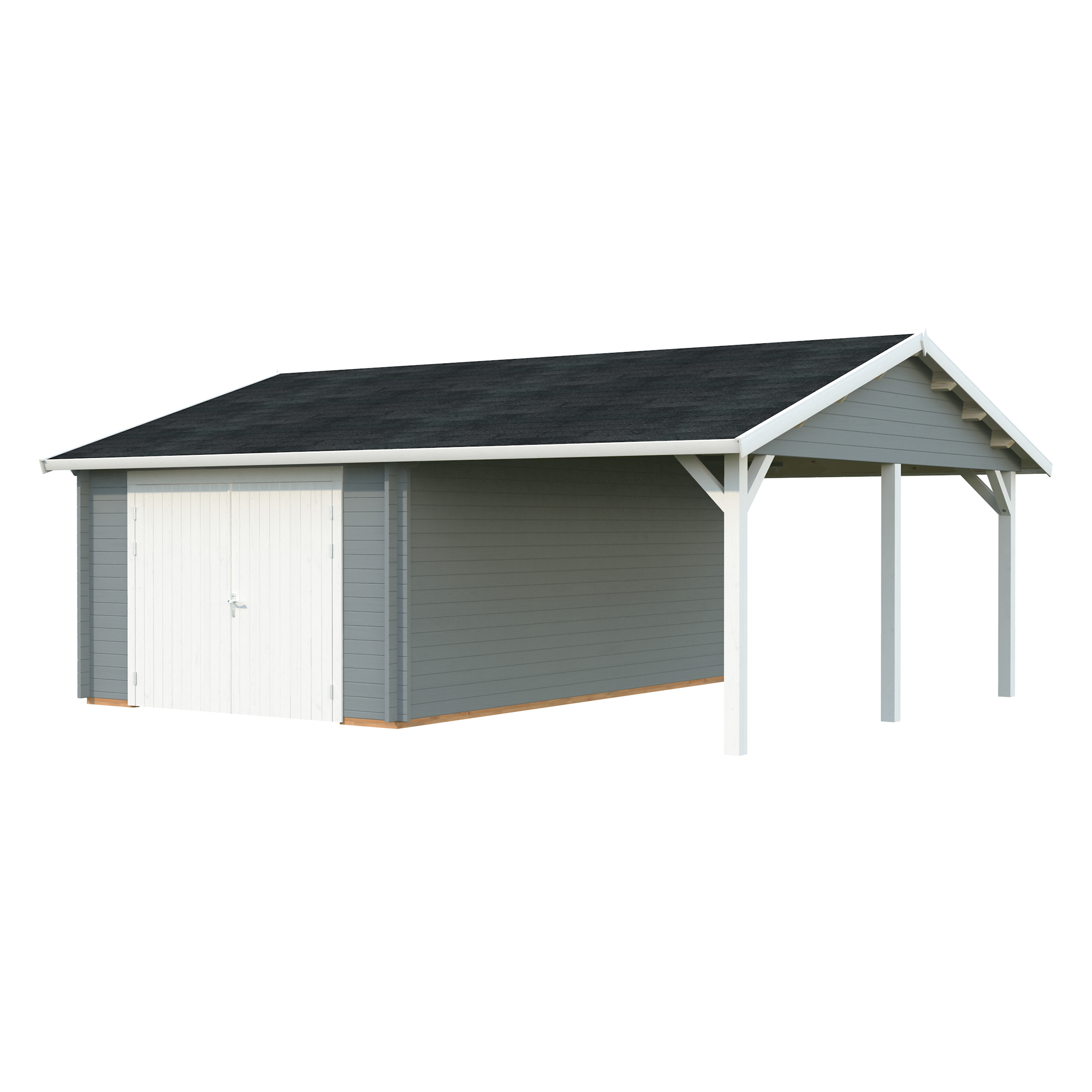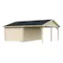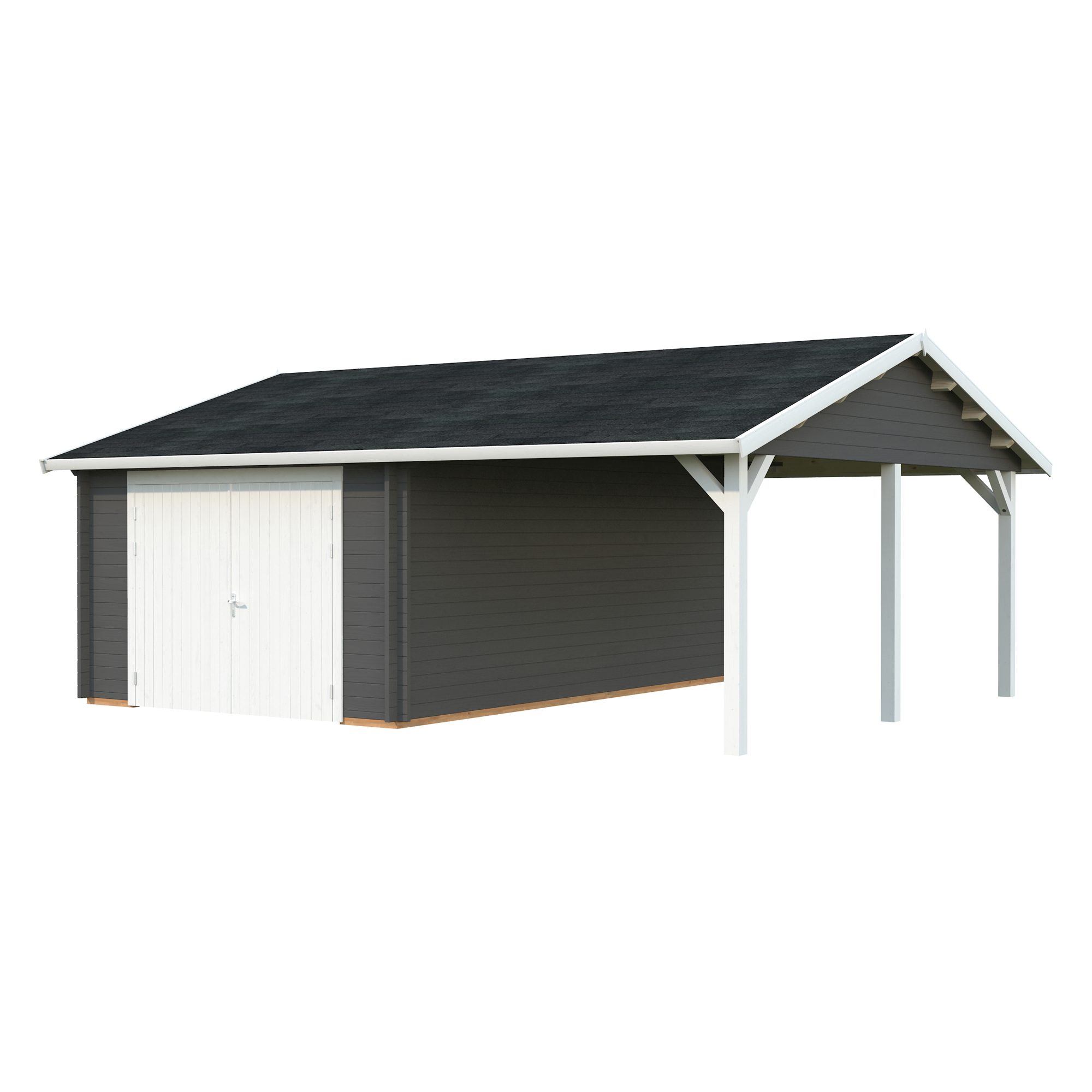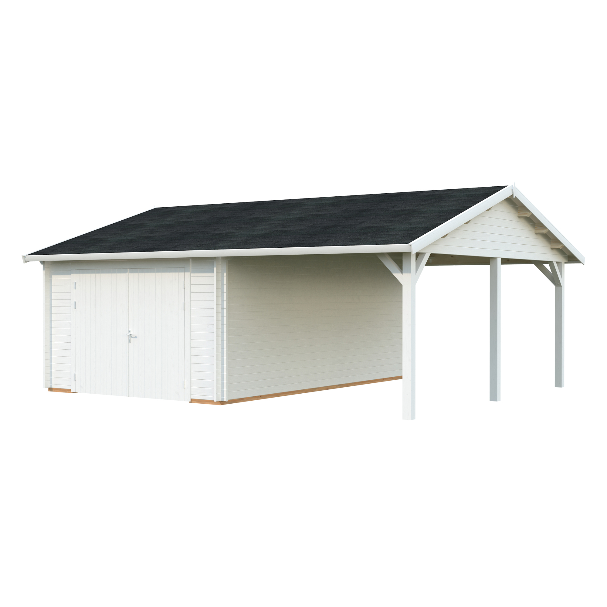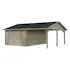 Palmakos garage Roger 19,0+16,2 m2 med solid 44 mm knuttimmervägg är inte bara den perfekta lösningen för att hålla din bil säkert inomhus, utan den har också funktionaliteten att behålla dina familjefordon under den skyddande carporten, samtidigt som det ger extra utrymme för dina förvaringsbehov. De generösa måtten gör att du kan parkera din bil bekvämt och har extra utrymme för verktyg, cyklar och andra föremål.