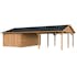 Palmakos garage Roger 19,0+33,2 m2 med solid 44 mm knuttimmervägg är inte bara den perfekta lösningen för att hålla din bil säkert inomhus, utan den har också funktionaliteten att behålla dina familjefordon under den skyddande carporten, samtidigt som det ger extra utrymme för dina förvaringsbehov. De generösa måtten gör att du kan parkera din bil bekvämt och har extra utrymme för verktyg, cyklar och andra föremål.