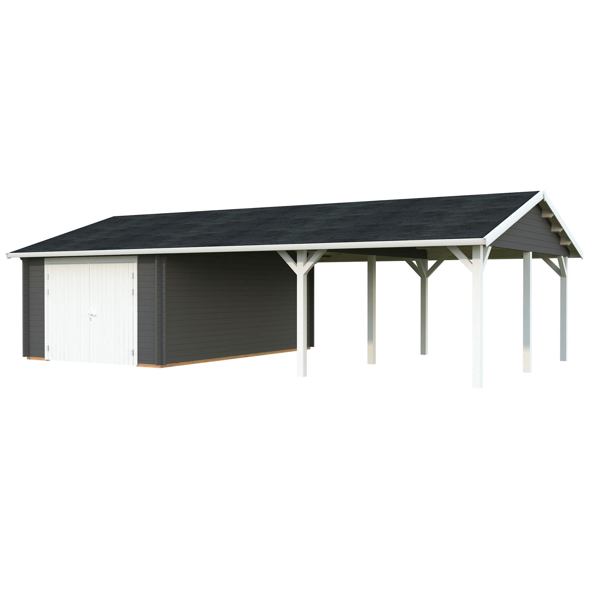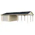 Palmakos garage Roger 19,0+33,2 m2 med solid 44 mm knuttimmervägg är inte bara den perfekta lösningen för att hålla din bil säkert inomhus, utan den har också funktionaliteten att behålla dina familjefordon under den skyddande carporten, samtidigt som det ger extra utrymme för dina förvaringsbehov. De generösa måtten gör att du kan parkera din bil bekvämt och har extra utrymme för verktyg, cyklar och andra föremål.