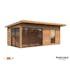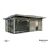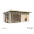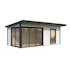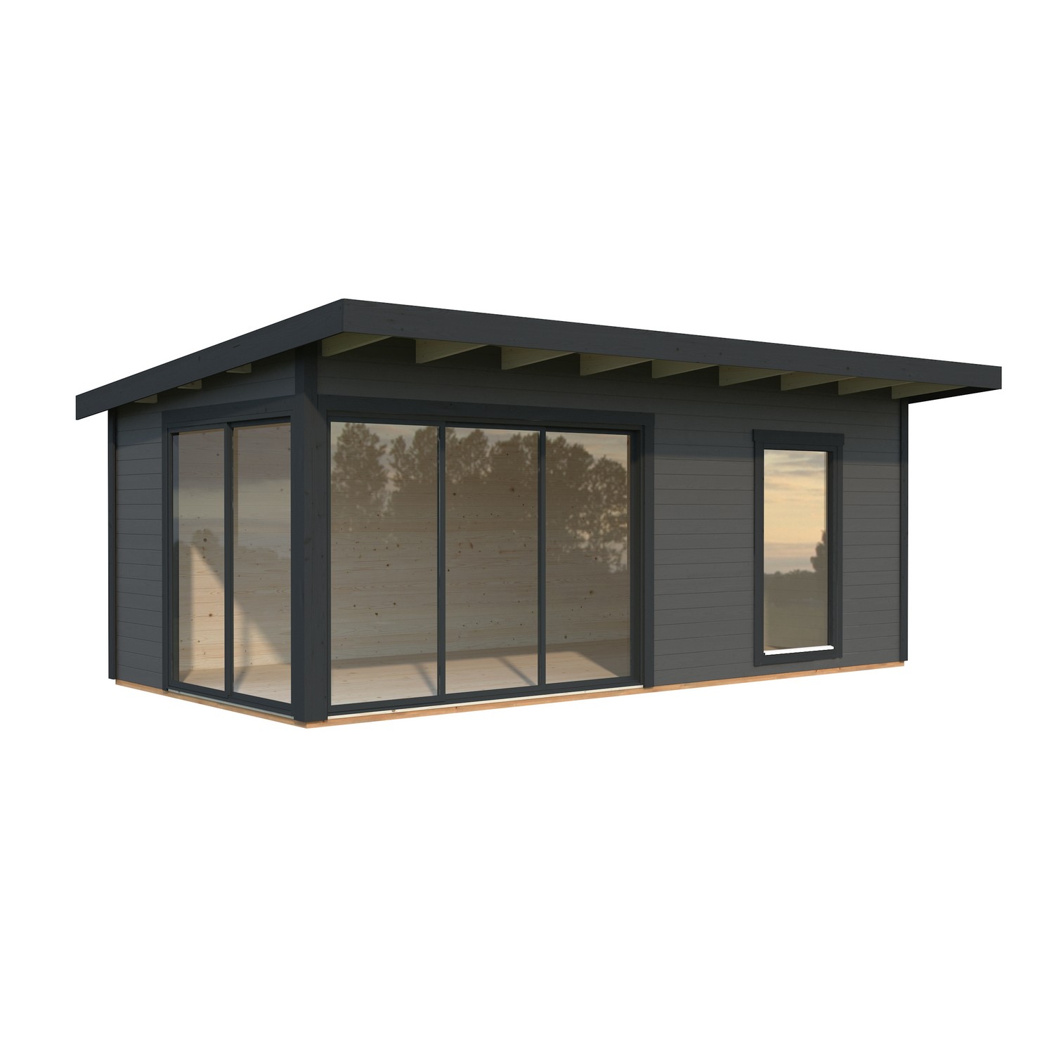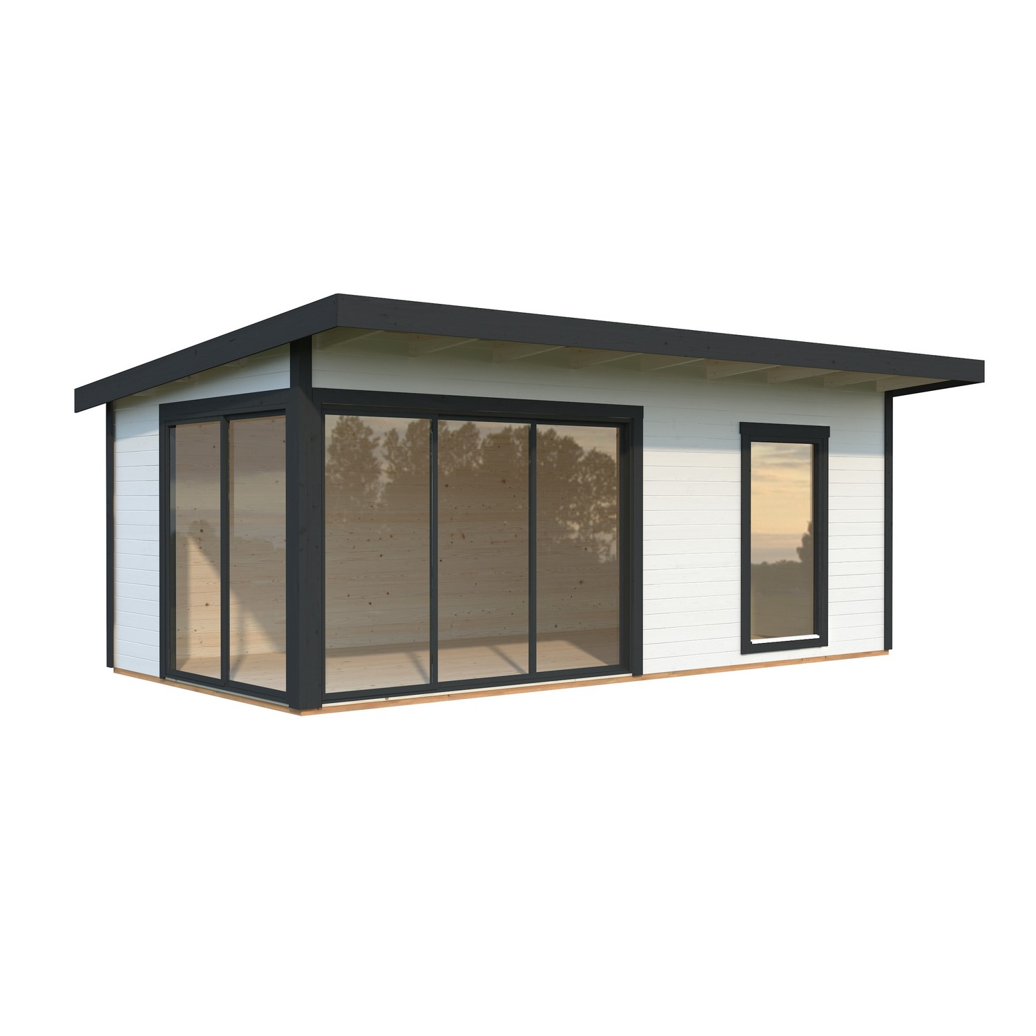 Stugan Andrea med flackt tak skapar ett modernt uttryck och blir ett stilfullt inslag i din trädgård. Skjutpartier finns även i två väggar så att dessa stora glasytorna släpper in generöst med ljus och tillåter fantastisk utsikt.