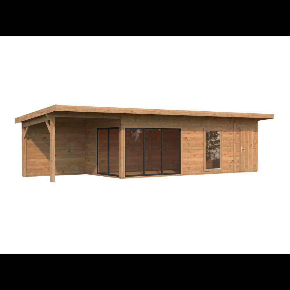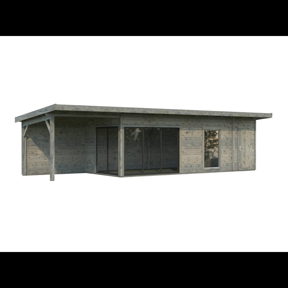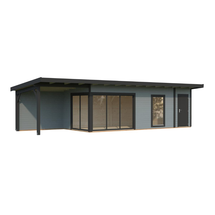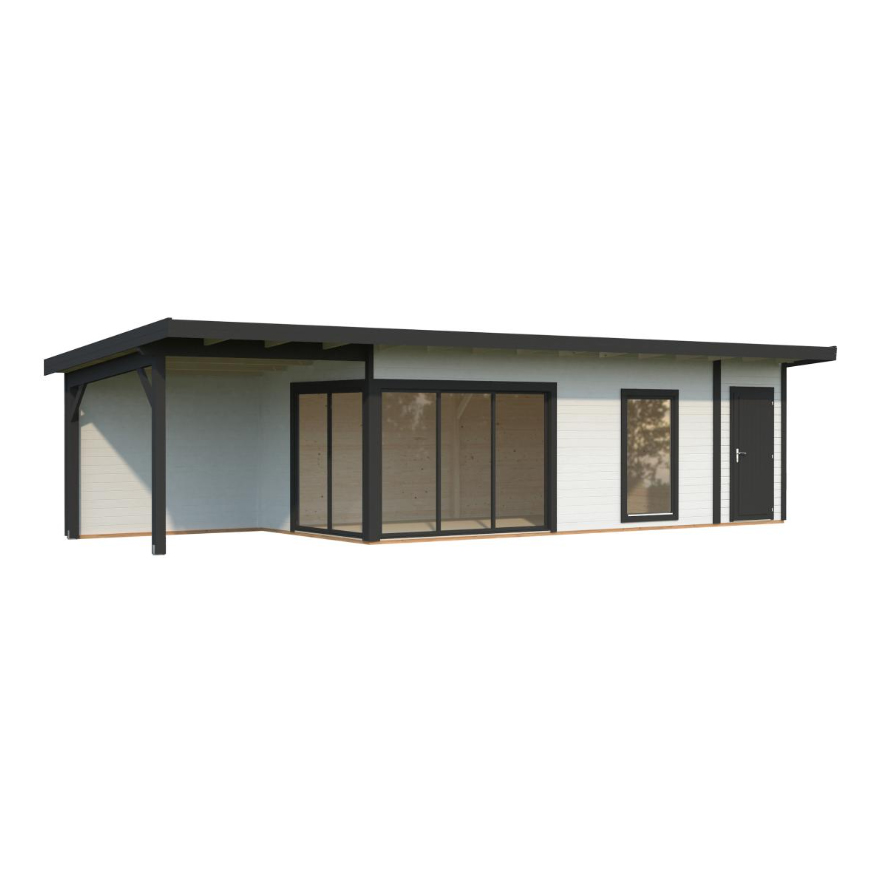 Modern trädgårdsstuga med sidobyggt förråd, skyddstak och dubbelglasade aluminiumskjutdörrar. Den moderna trädgårdsstugan Andrea 21,1+7,9 m² Slide Plus är en stilfull och funktionell byggnad som förhöjer ditt uterum. Den har en rymlig huvudyta på 17,1 m², ett integrerat förråd på 4,0 m² samt en 7,9 m² sidokupa med bakvägg, vilket gör stugan idealisk som hemmakontor, ateljé, gästrum eller fritidsretreat.Byggd av högkvalitativ nordisk gran har stugan 44 mm tjocka väggar med moderna skruvade hörnförband som ger både stabilitet och ett elegant utseende. Den platta takdesignen kompletterar den moderna trädgårdsestetiken, medan det integrerade förrådet och sidokupan erbjuder praktisk förvaring och skyddade utomhusytor.